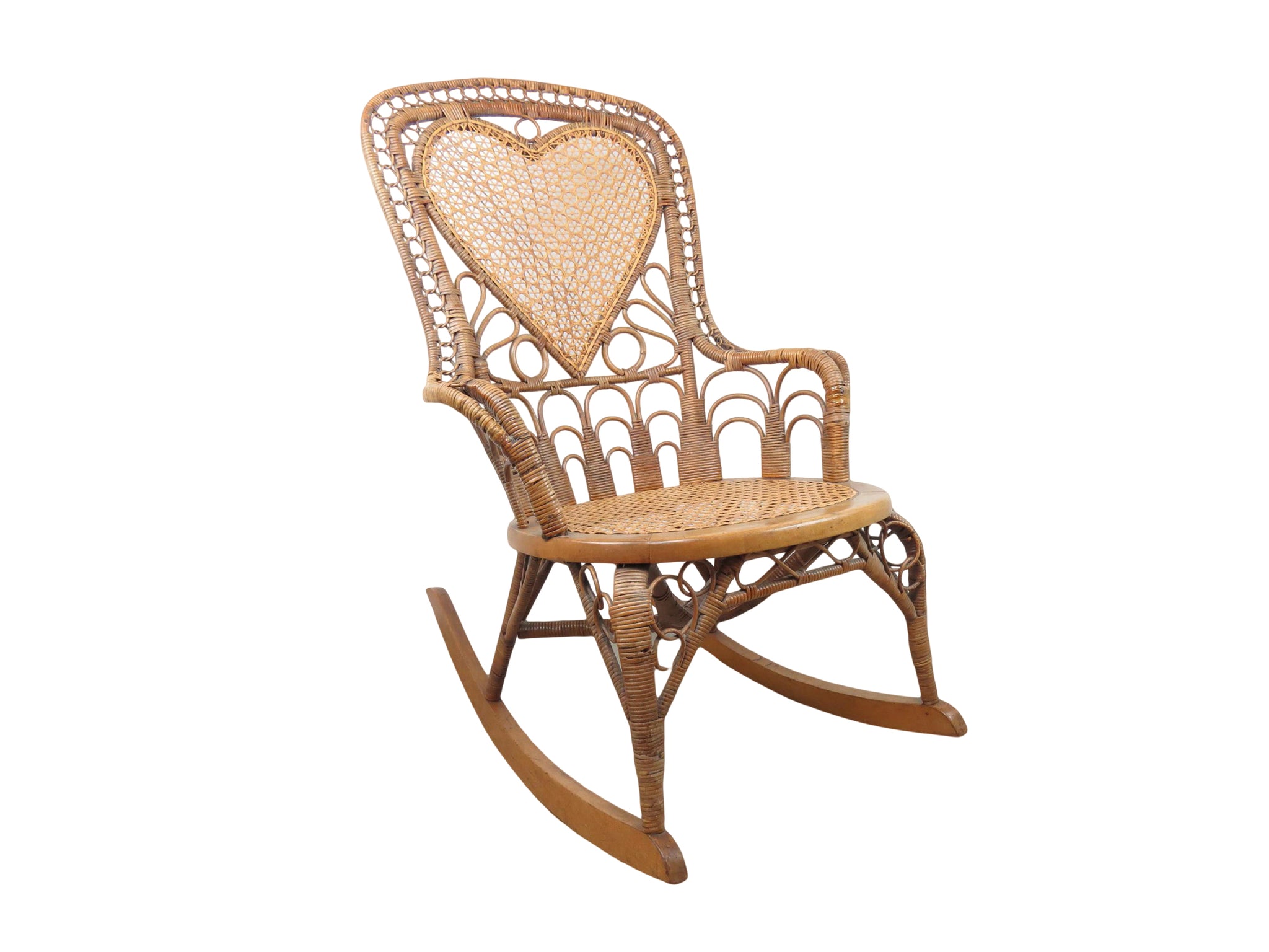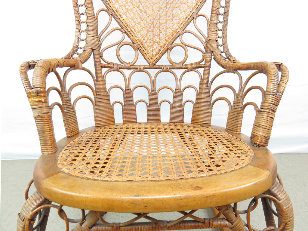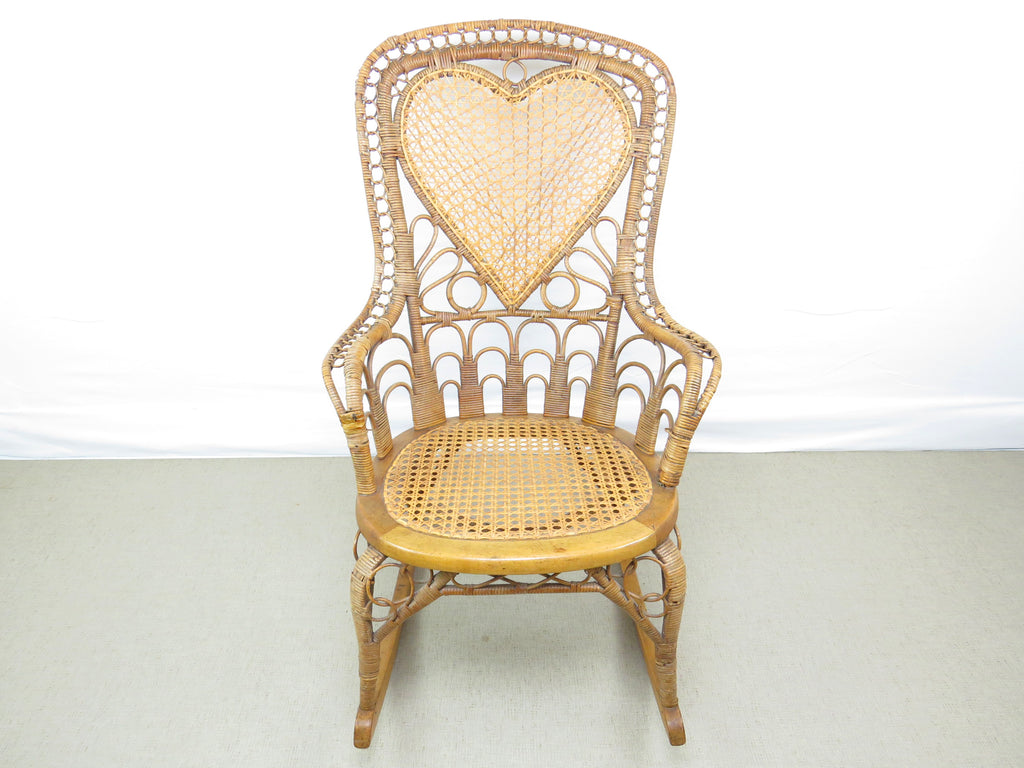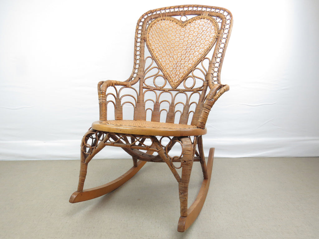 Antique natural wicker rocking chair with four types of hand caning attributed to Heywood Brothers and Wakefield Rattan Co circa 1890's. The centerpiece of this stunning chair is a heart medallion connected by scroll and figure-eight connector. Intricately woven throughout, from top to bottom with a hint of Art Deco cityscape element at base of chair back. Artful sculptural lines, a masterful example of early Americana wicker weaving and craftsmanship. Truly a work of art!