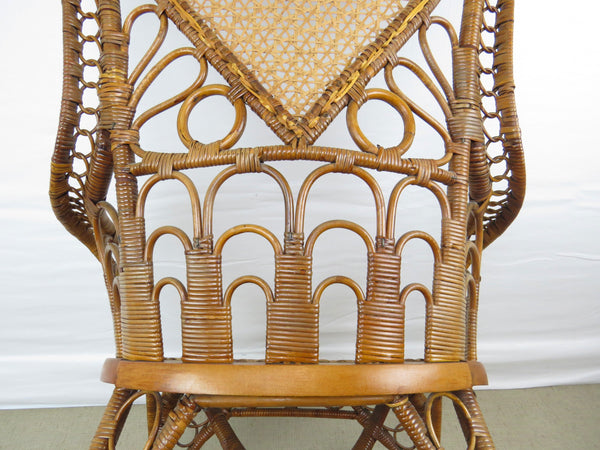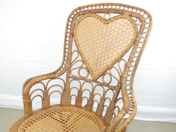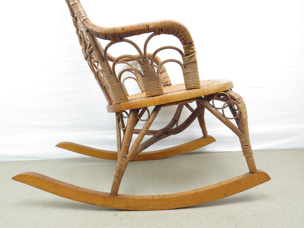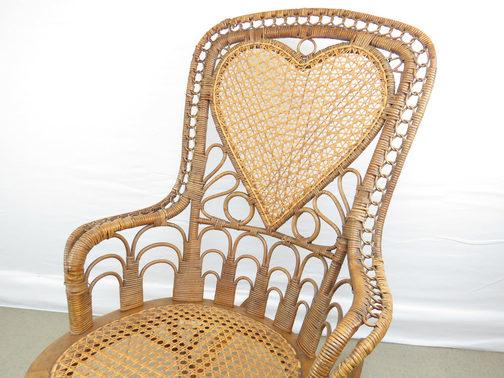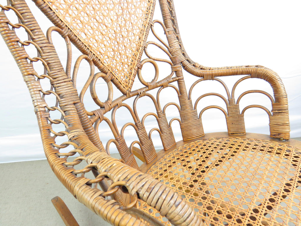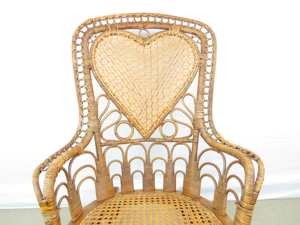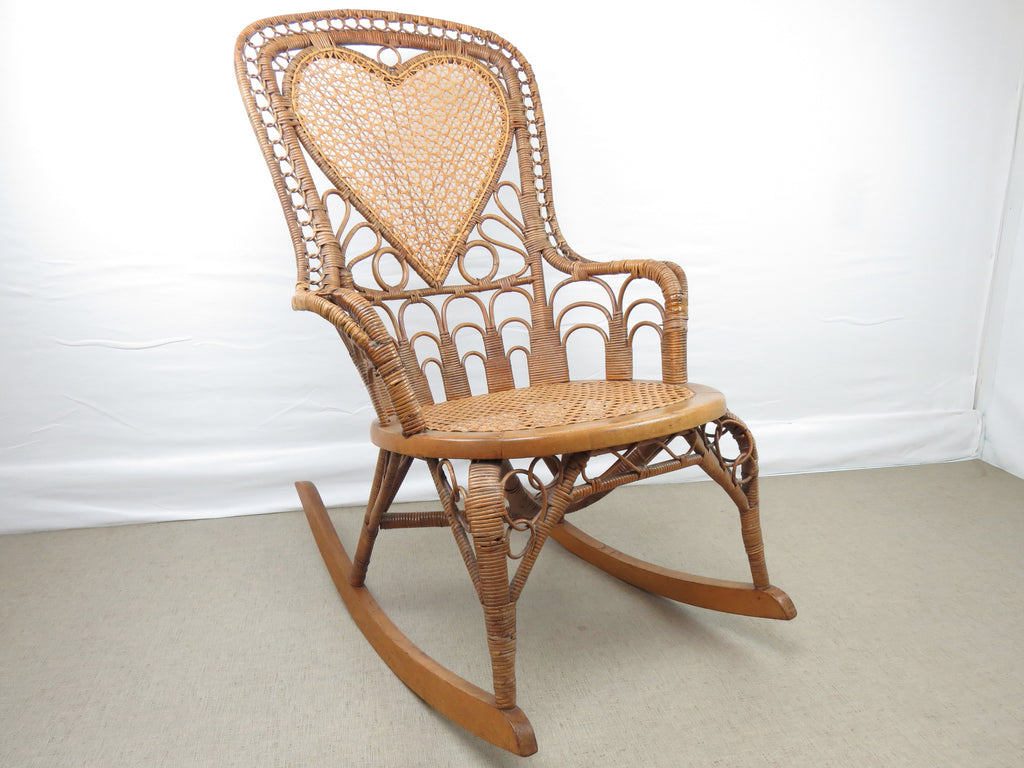Antique natural wicker rocking chair with four types of hand caning attributed to Heywood Brothers and Wakefield Rattan Co circa 1890's. The centerpiece of this stunning chair is a heart medallion connected by scroll and figure-eight connector. Intricately woven throughout, from top to bottom with a hint of Art Deco cityscape element at base of chair back. Artful sculptural lines, a masterful example of early Americana wicker weaving and craftsmanship. Truly a work of art!