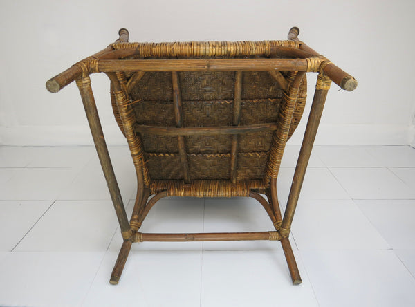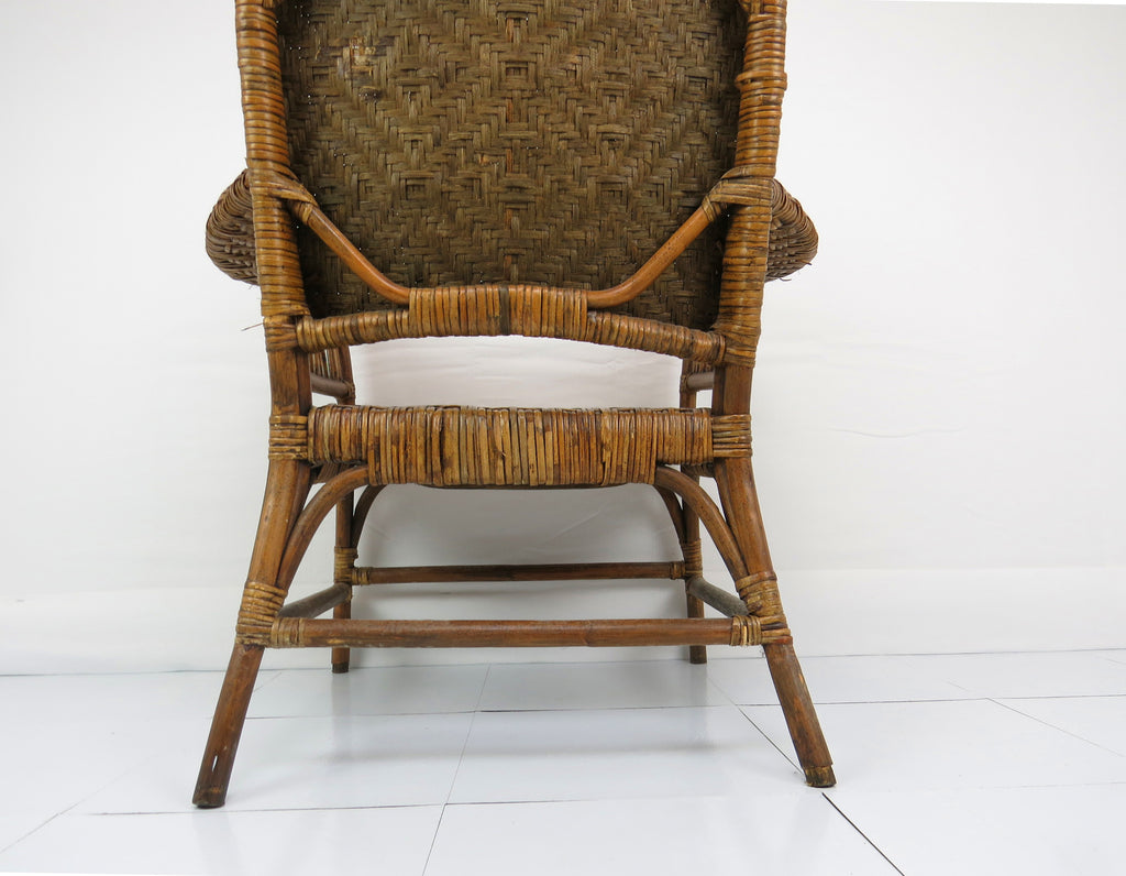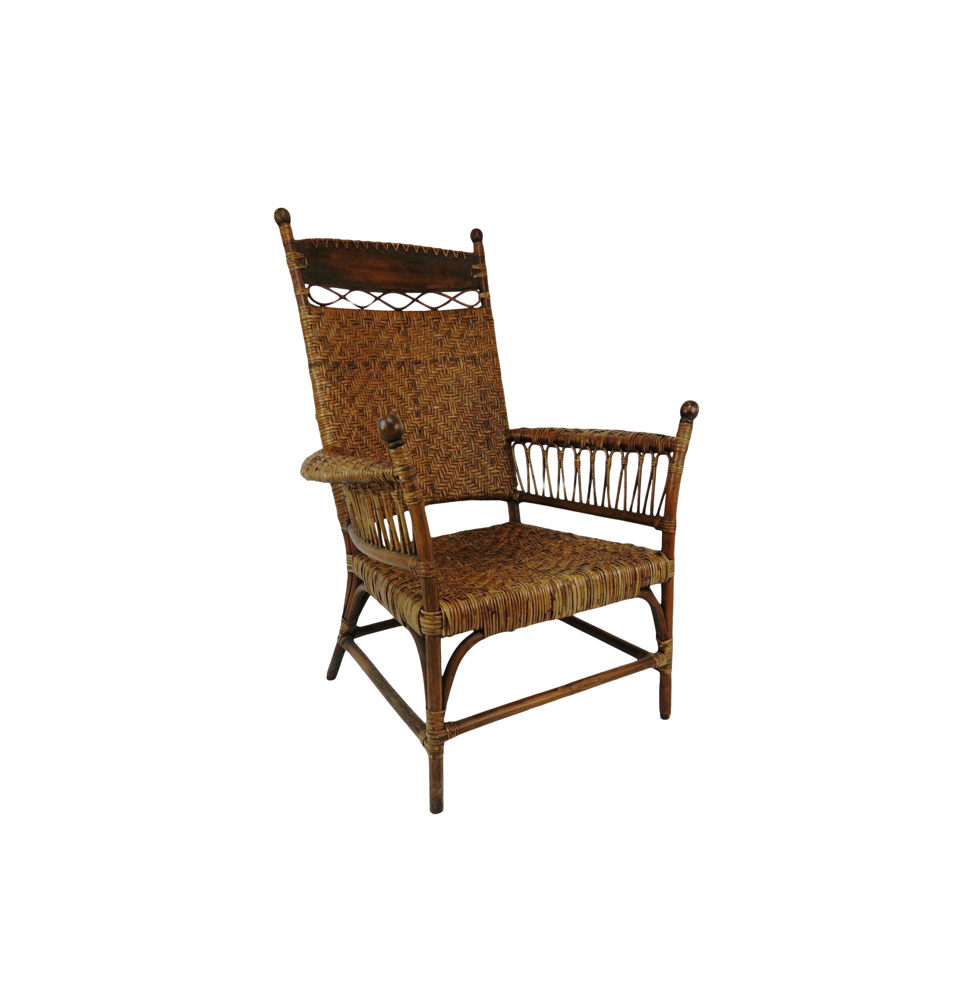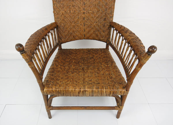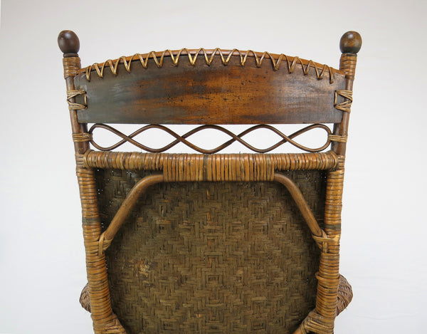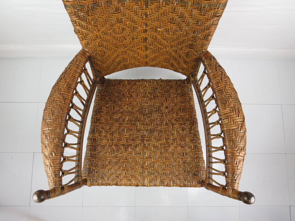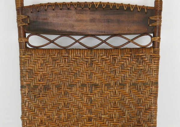 A fine antique Old Hickory style Victorian sculptural bentwood and cane Adirondack form lounge chair. This intricately woven chair is a stand-out for its amazing sculptural lines. Tight splint weaving with delicate figure-8 patterns and bent hardwood throughout. Tightly woven caning on seat, back and bowed arm rest. The head rest is of a solid piece of curved wood with great antique patina of the period. Solid splayed legs supported by four stretchers. A true statement chair finished off with classic stick and ball on arms and back. Lastly this chair is constructed entirely without screws or metal hardware. The tight weaving, joinery, and master craftsmanship holds this chair together organically.