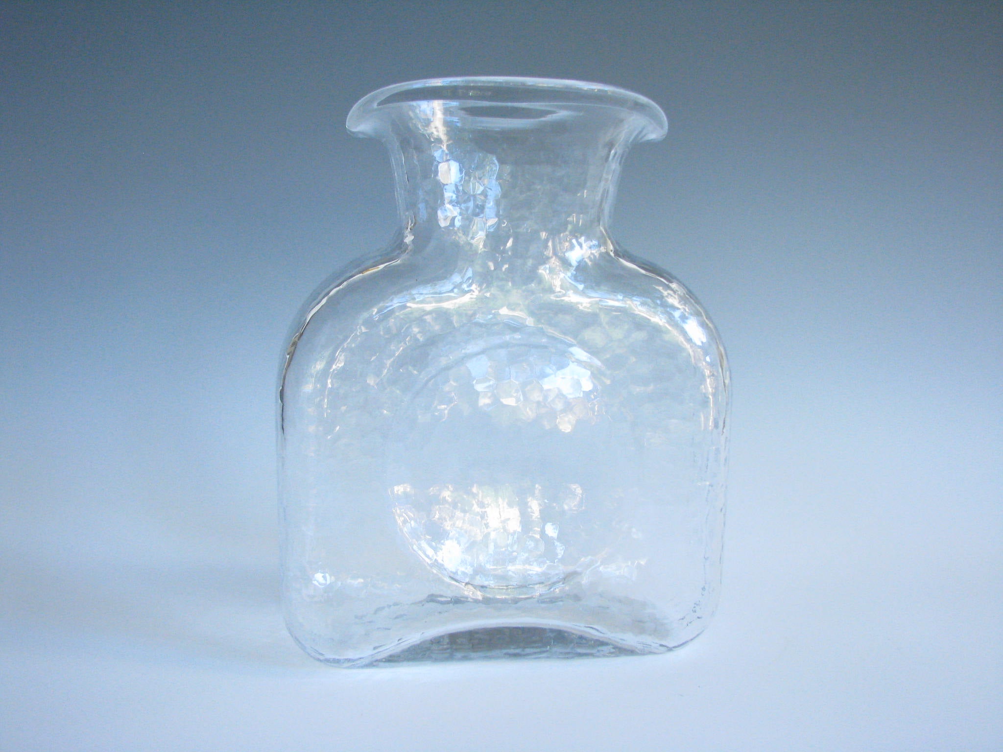 Iconic Blenko glass water bottle (Item 284) in Crystal color with Diamond Optic pattern.. Introduced in 2011-2012, Diamond Optic line of pitchers were a "new twist on a classic design". No Blenko sticker. No etching on bottom of bottle.