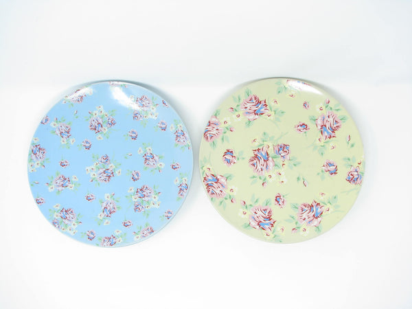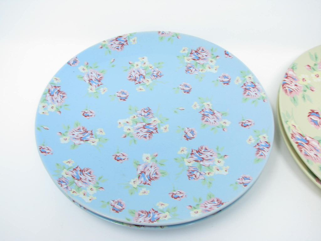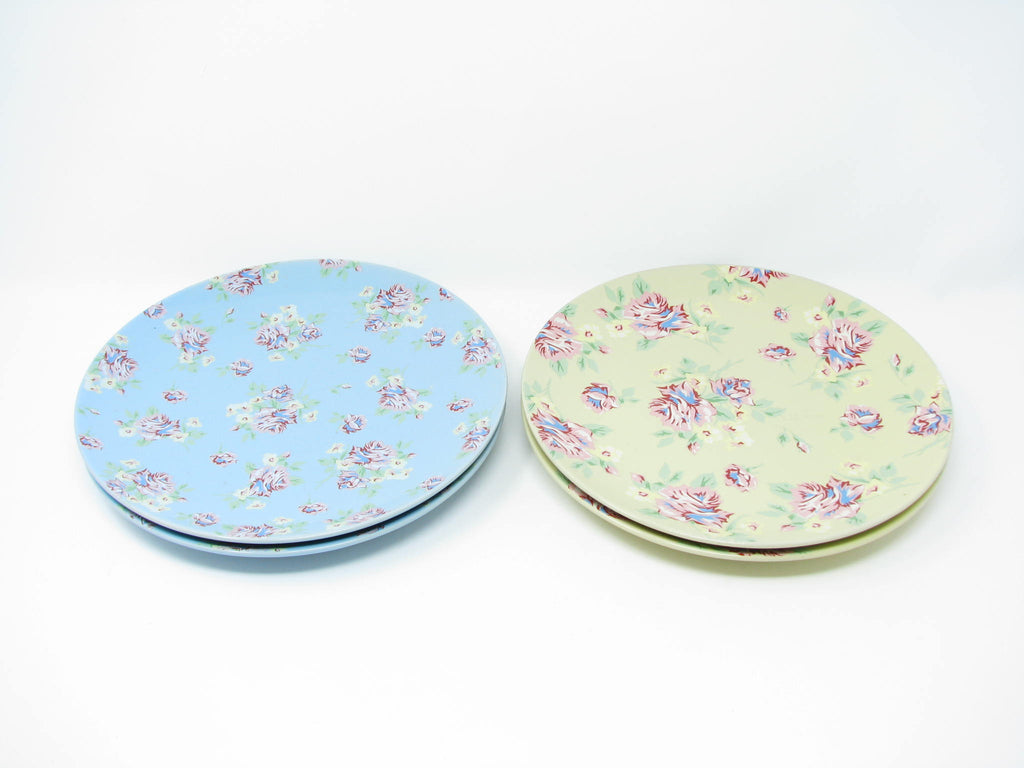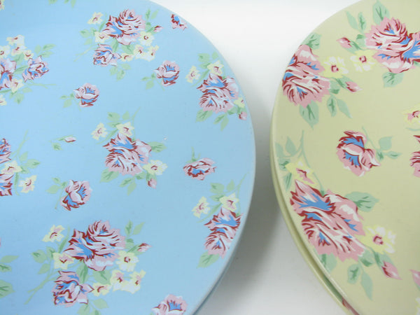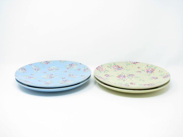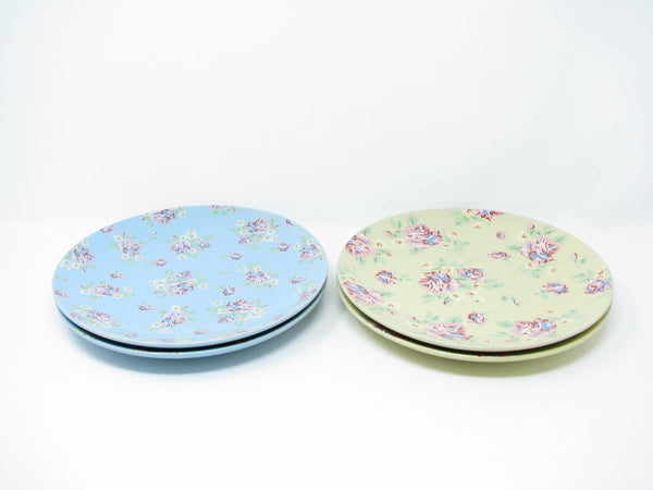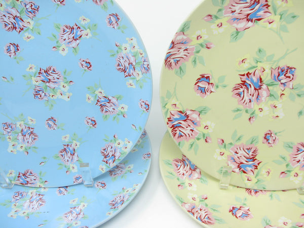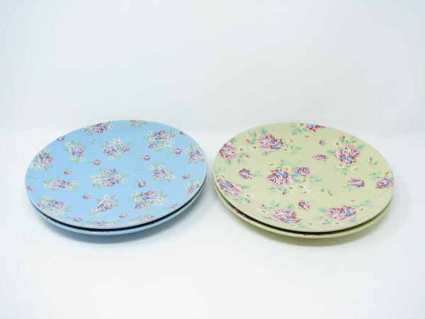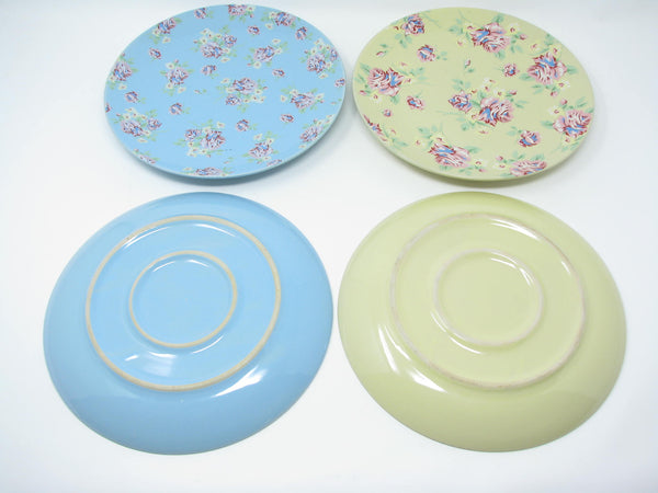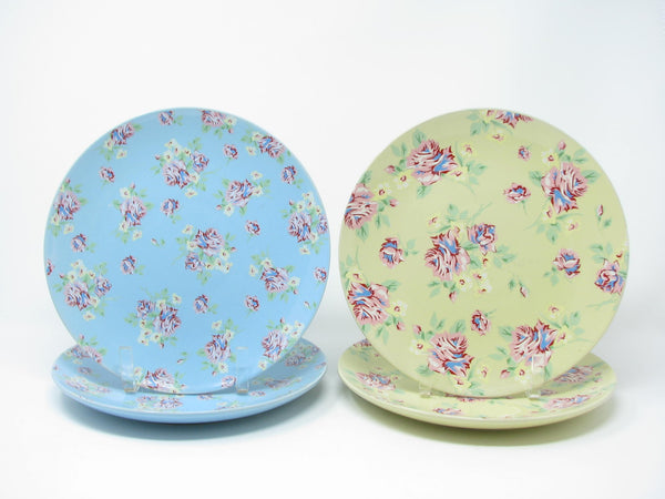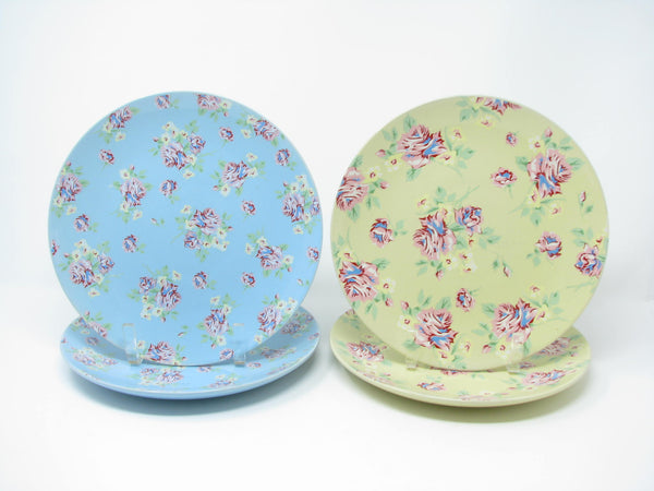 Contemporary set of 4 mix match salad plates in turquoise and yellow with floral decals. Vibrant colors and sweet floral chintz pattern. Includes 2 turquoise and 2 yellow plates. Unknown maker or origin.
