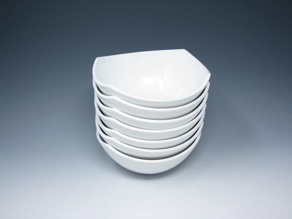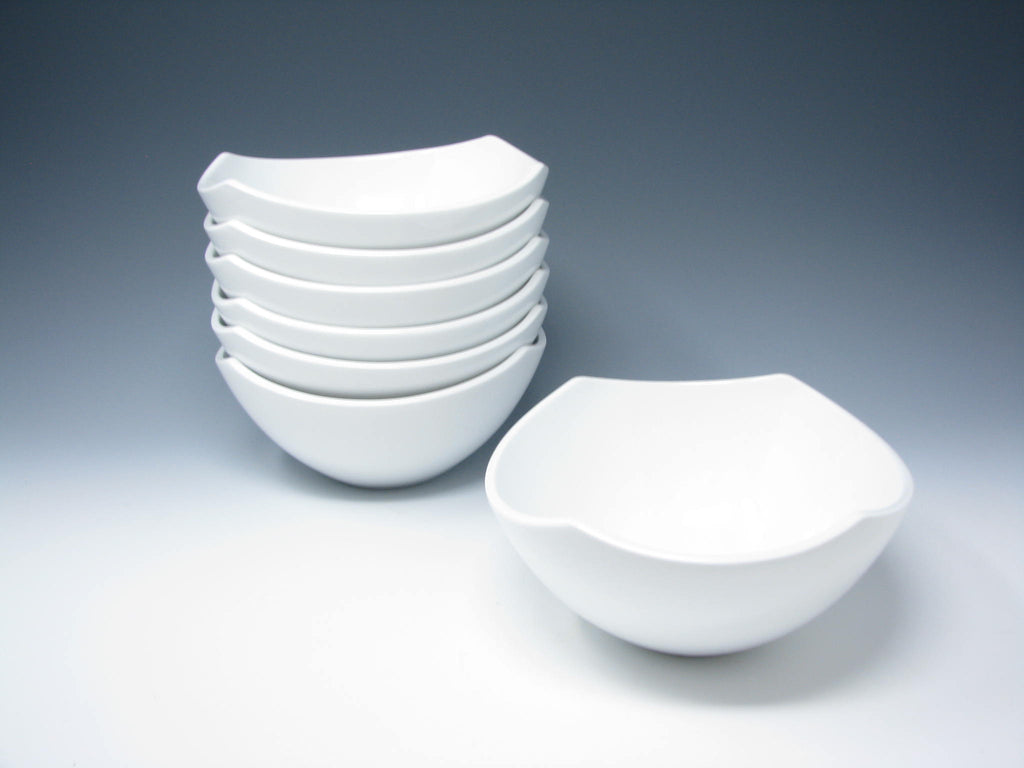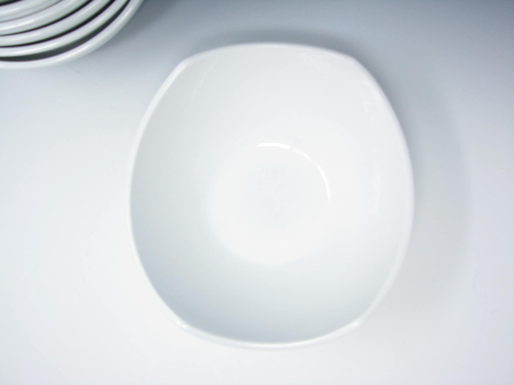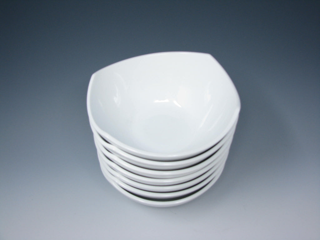 Set of 7 Dansk Classic Fjord white high-grade porcelain bowls with coupe, square-ish shape. This pattern was produced from 2009-2020. According to the manufacturer these are microwave and dishwasher safe.