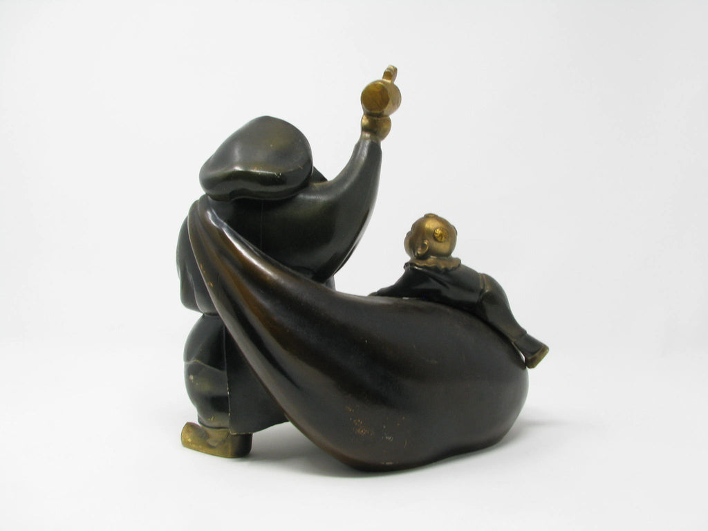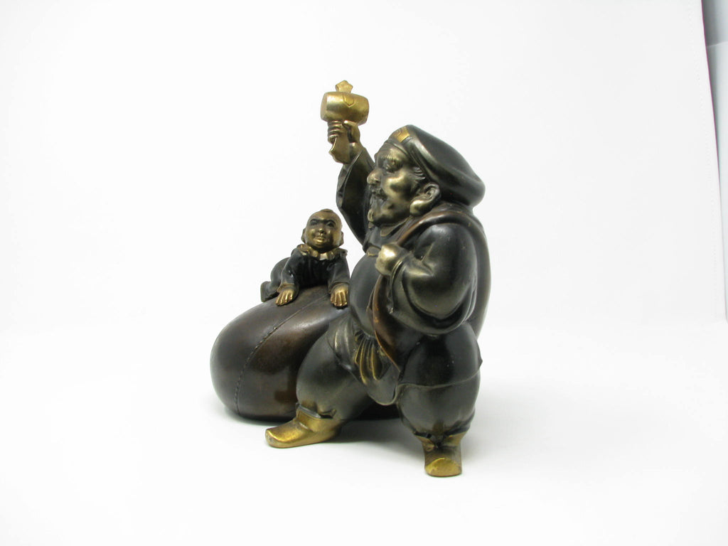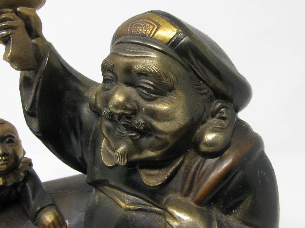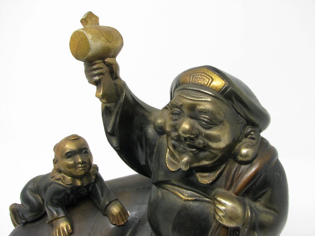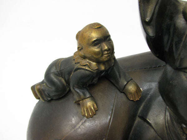 Early 20th Century Chinese Republic period bronze sculpture. A fun and playful subject of a Chinese man banging on a drum while a little boy, sitting on a large gourd, stares in admiration. A fine casting with stunning details. Beautiful natural bronze patina.