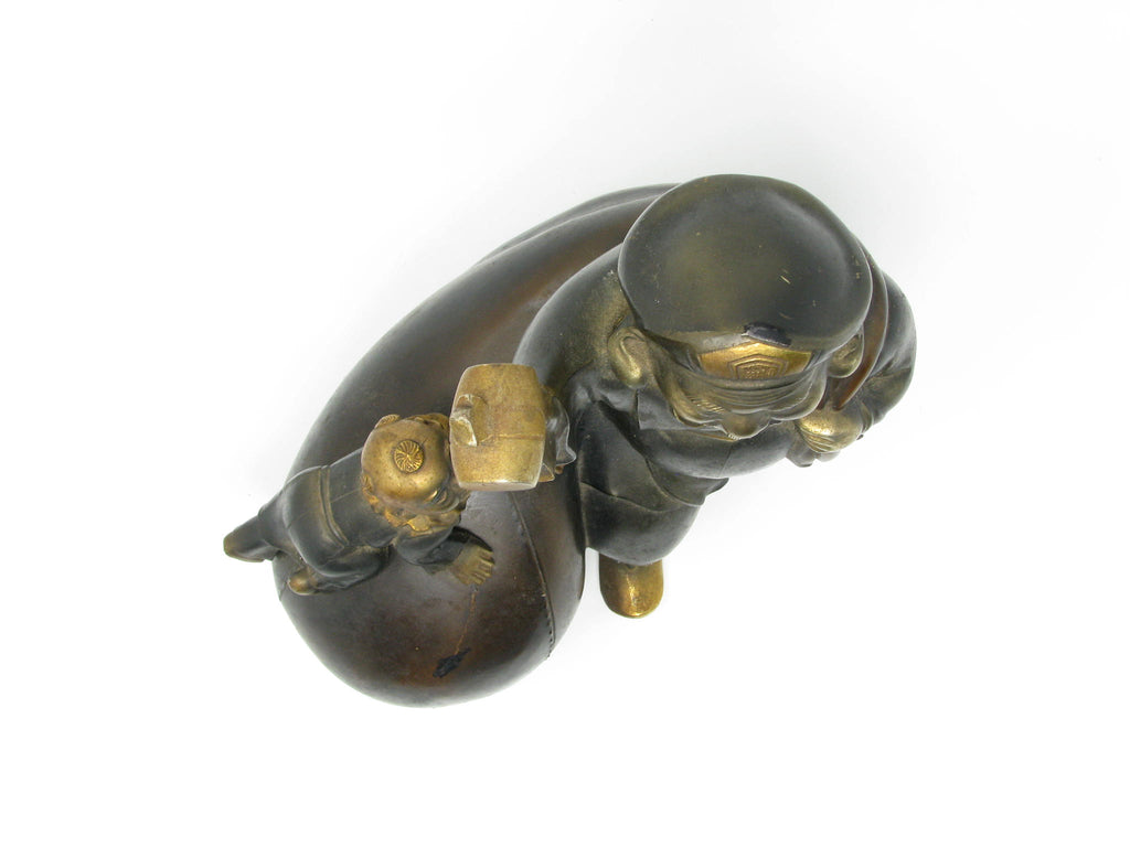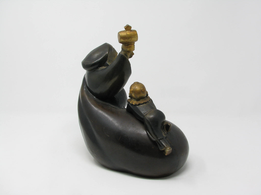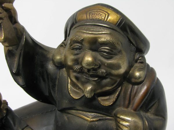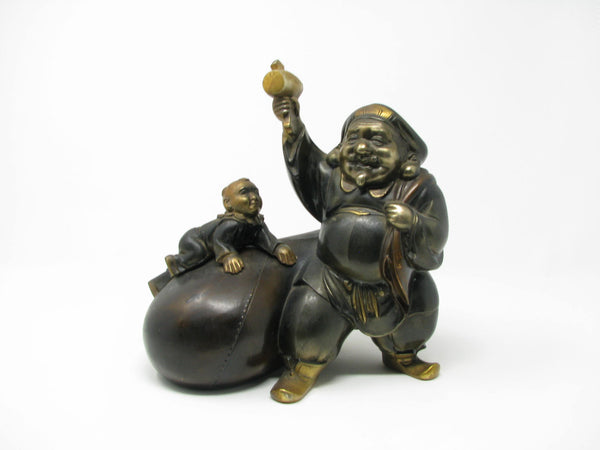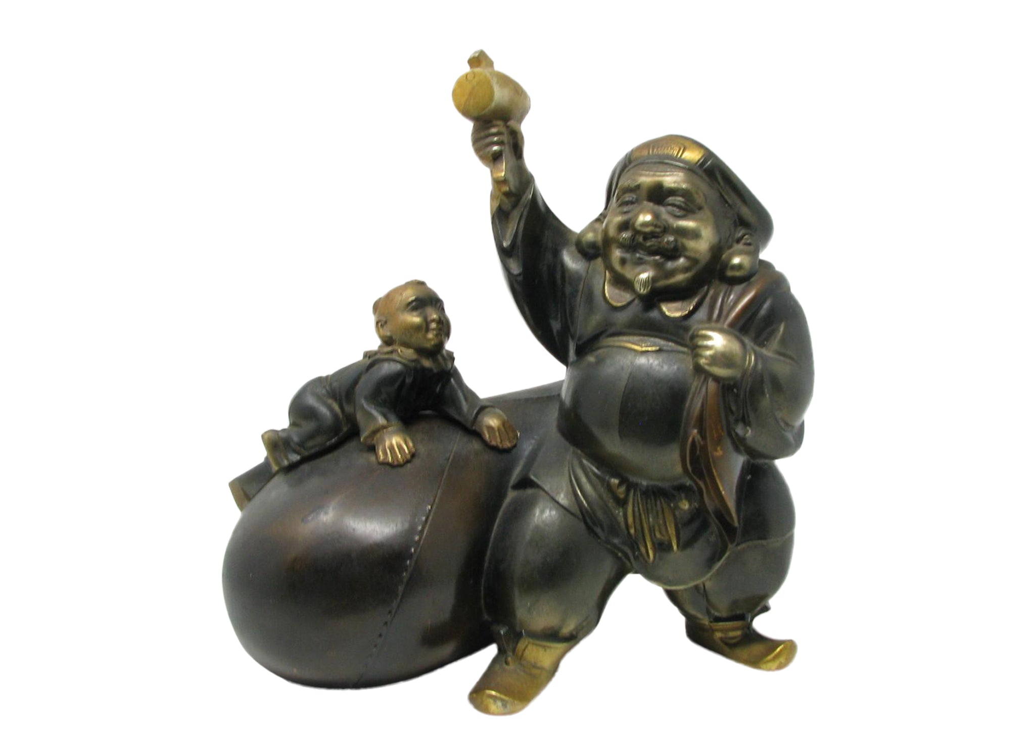 Early 20th Century Chinese Republic period bronze sculpture. A fun and playful subject of a Chinese man banging on a drum while a little boy, sitting on a large gourd, stares in admiration. A fine casting with stunning details. Beautiful natural bronze patina.