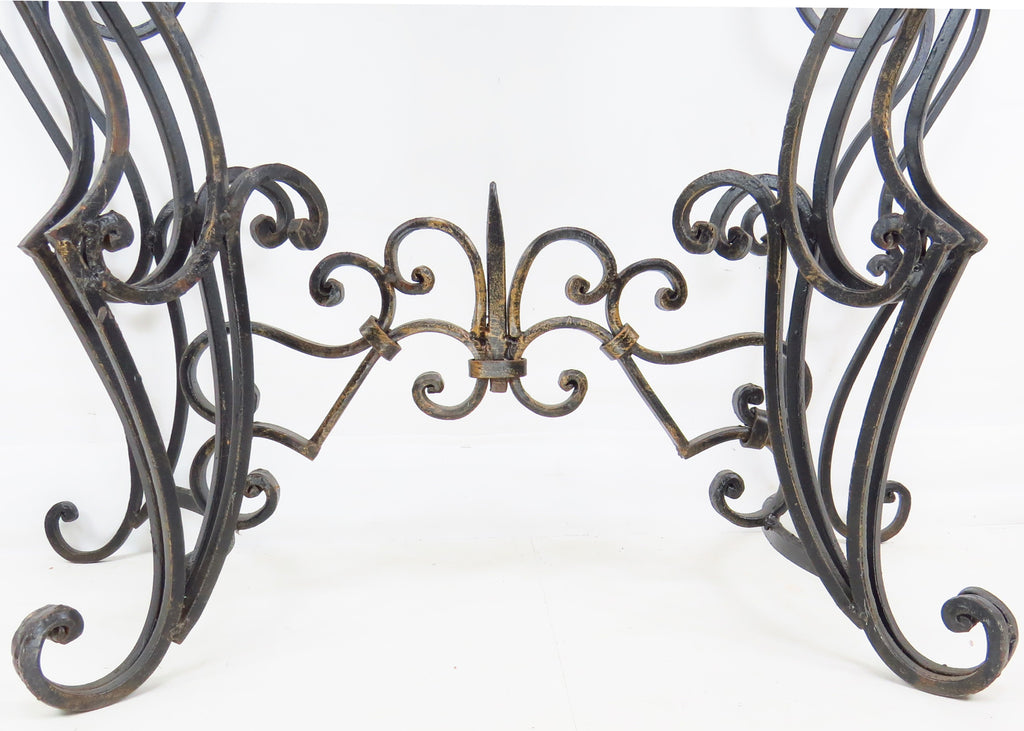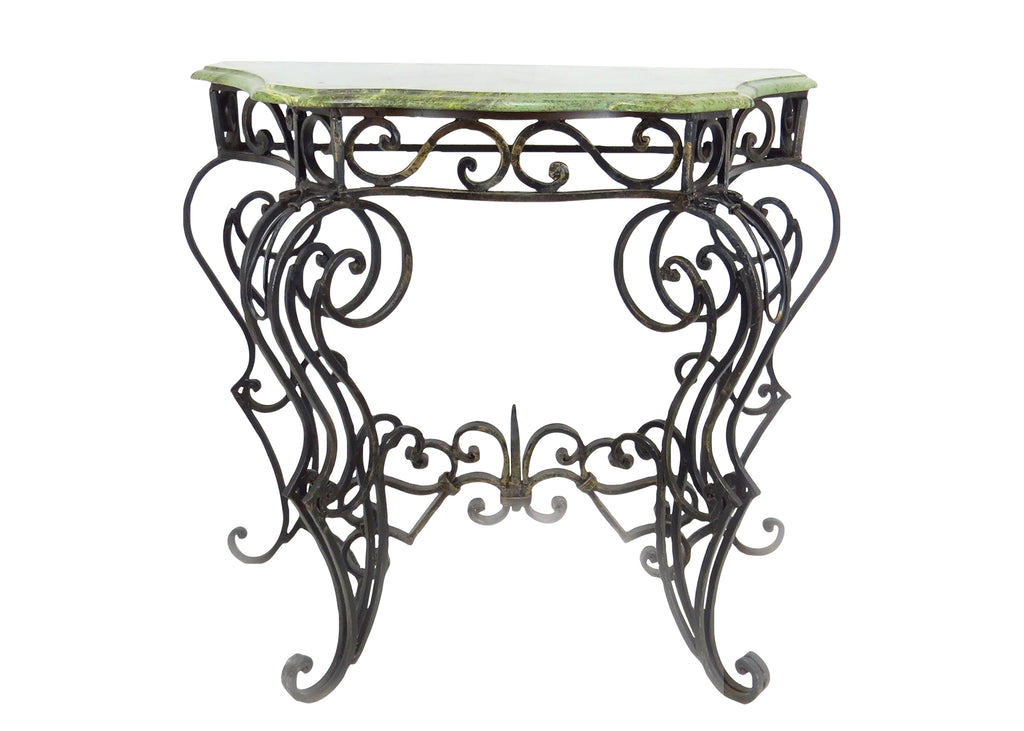 A French Louis XV style solid wrought iron console table with jade green marble top. Fine example of the Louis XV era of opulence and grandeur. This sculptural piece is a fine representation of the period's iconic cabriole legs, masterful forged iron scrolls and a fleur-de-lis as a supporting cross bar support. Serpentine marble top with OG edge.