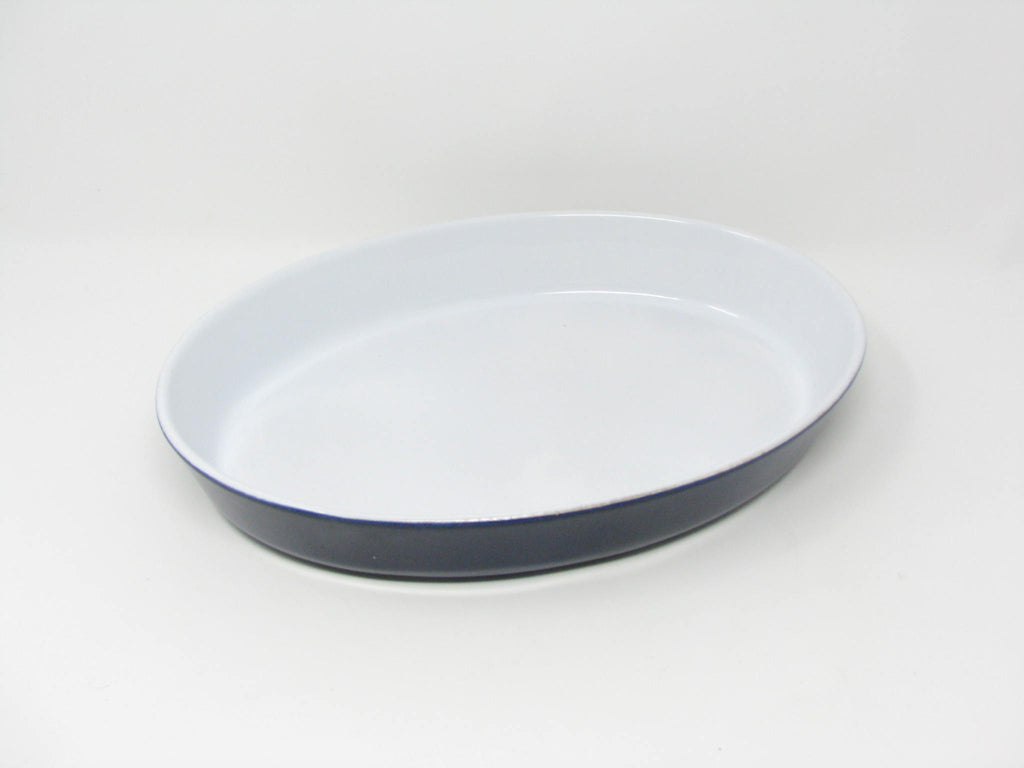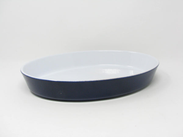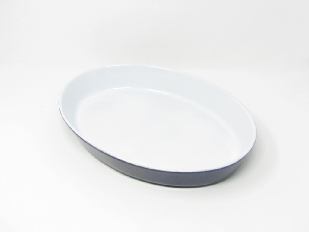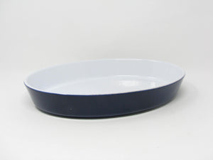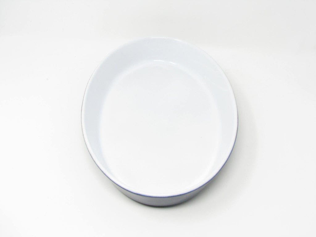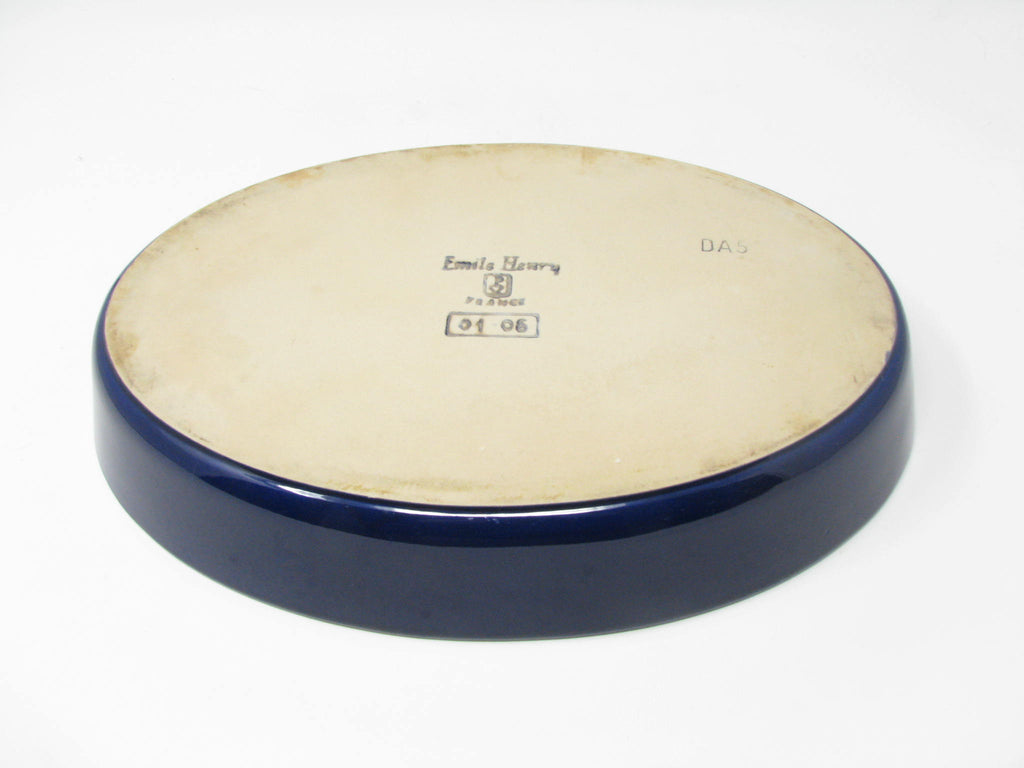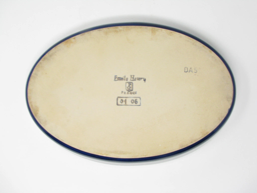 Large Emile Henry blue and white oval baking dish. Marked 'Emile Henry France 01-06 DA 5'.