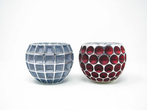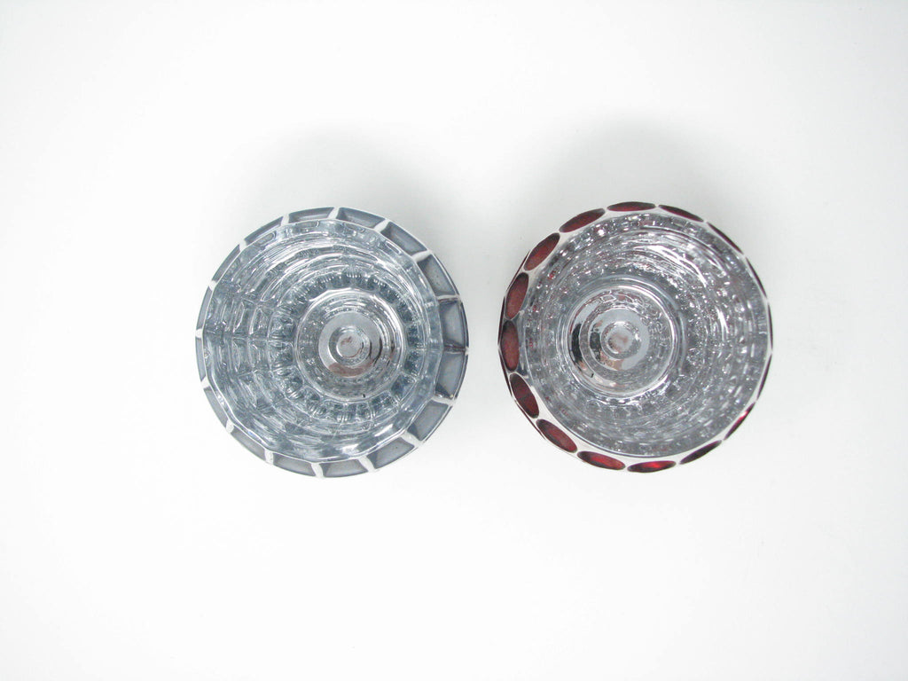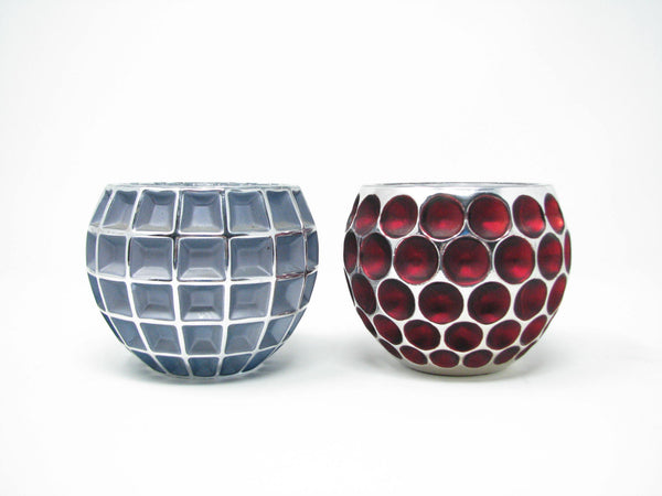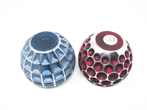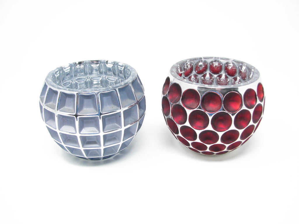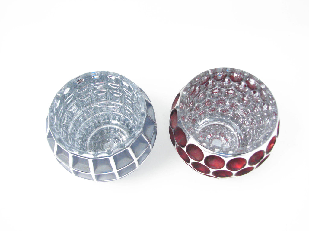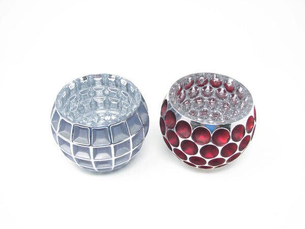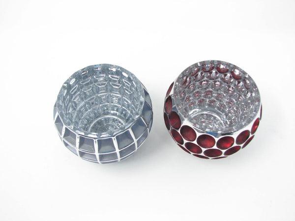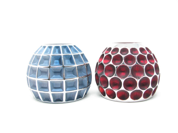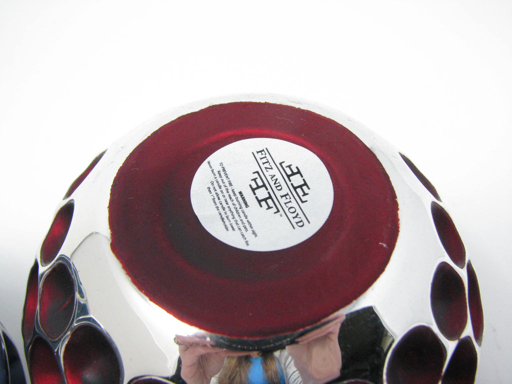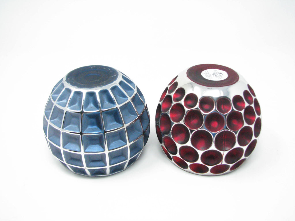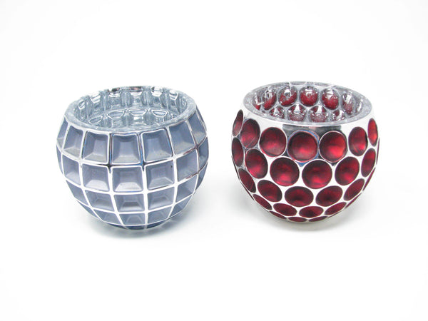Set of 2 Fitz & Floyd Fifth Avenue glass sphere candle holders with red optic dot and blue facet designs.