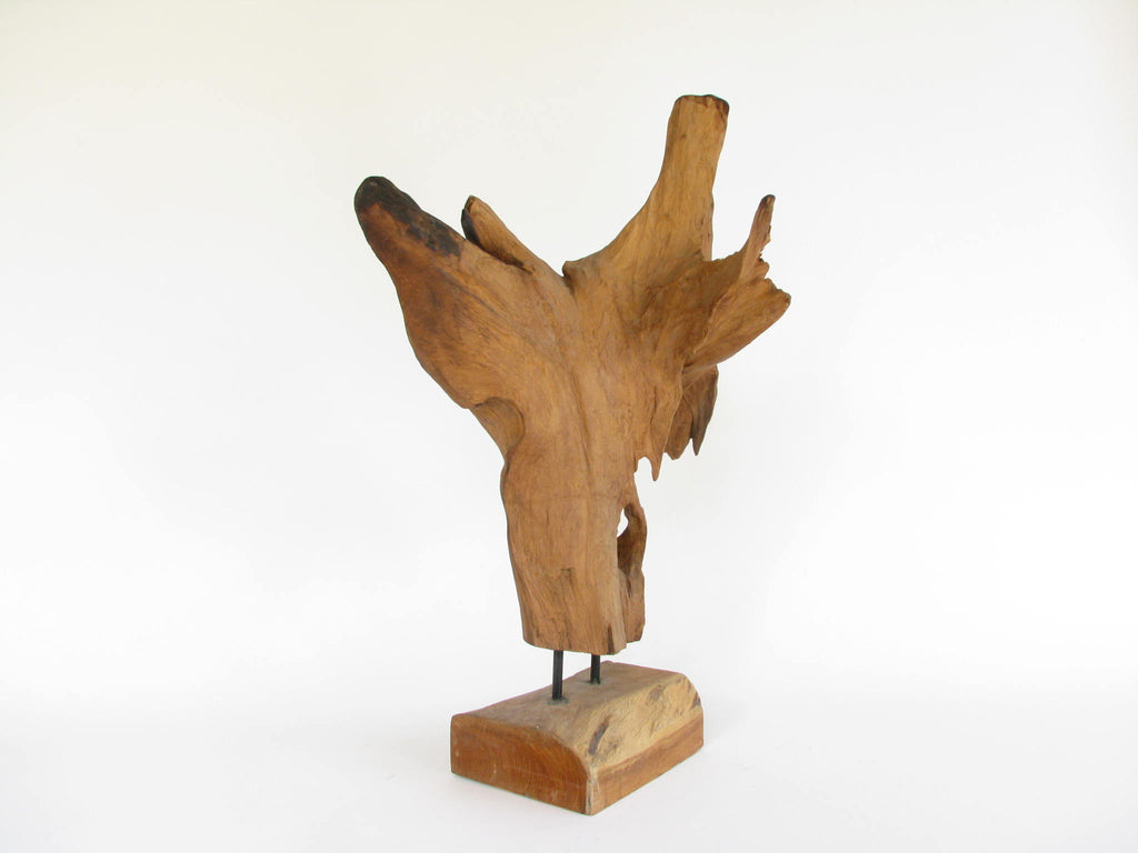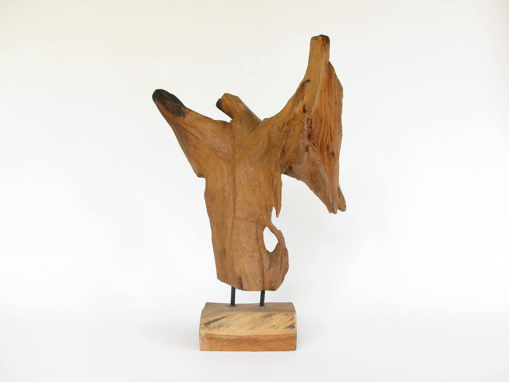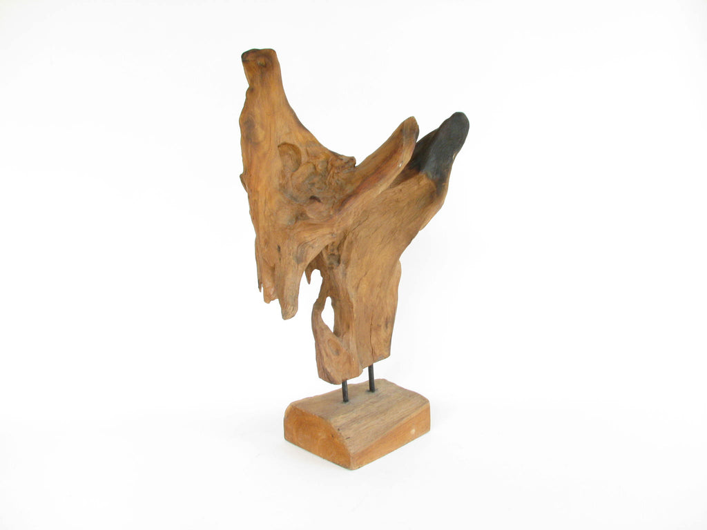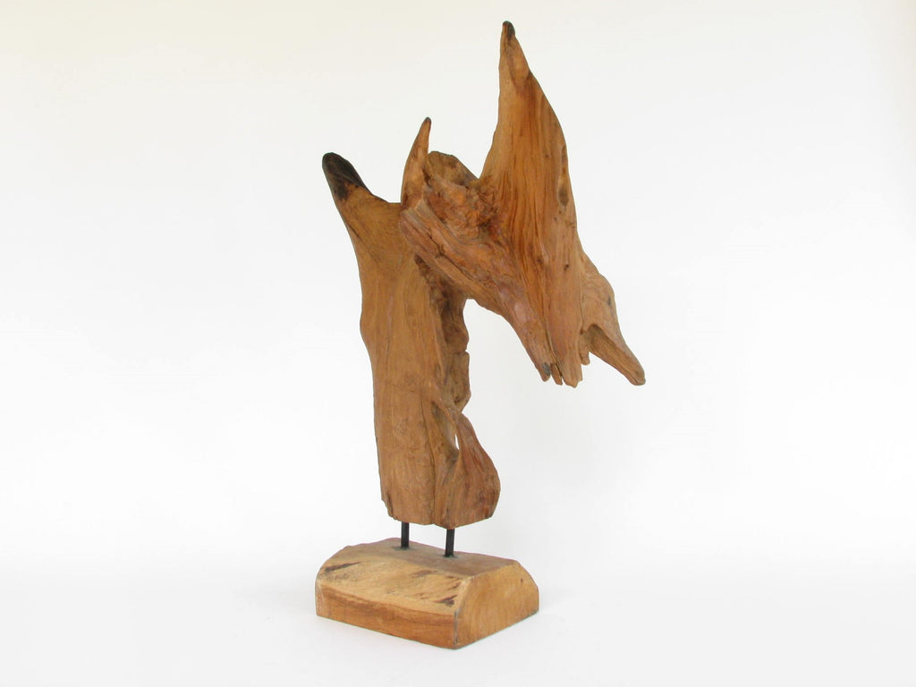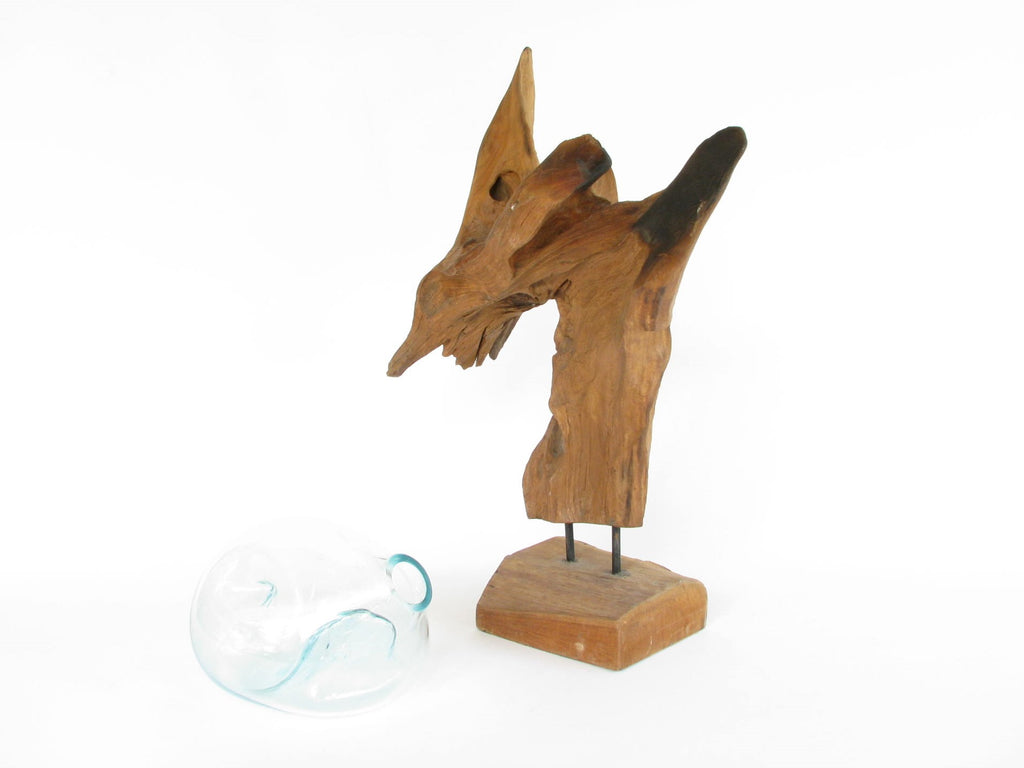 Hand carved driftwood sculpture with fitted hand blown glass vase or terrarium. Unique piece of art, fully hand-crafted. When we procured these there was a great deal of dust (which we have since cleaned off), leading us to believe that these items may be late 20th Century or early 2000s.