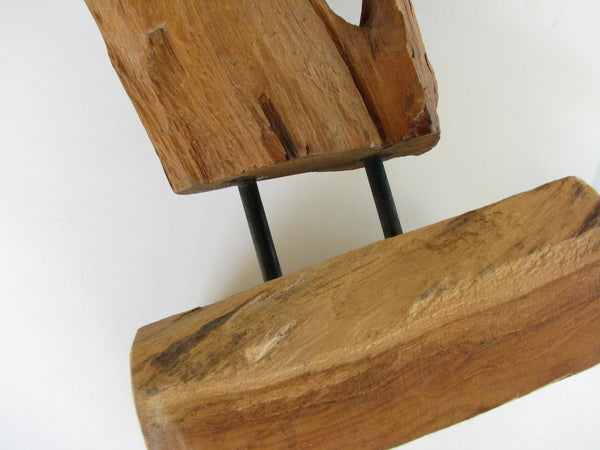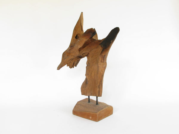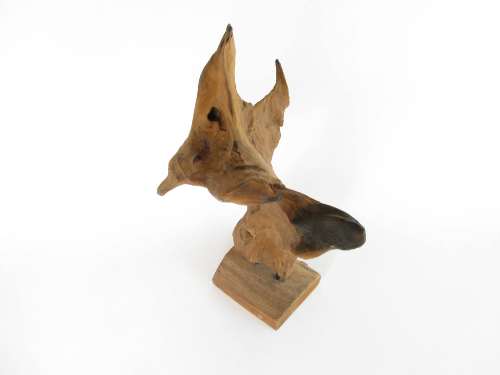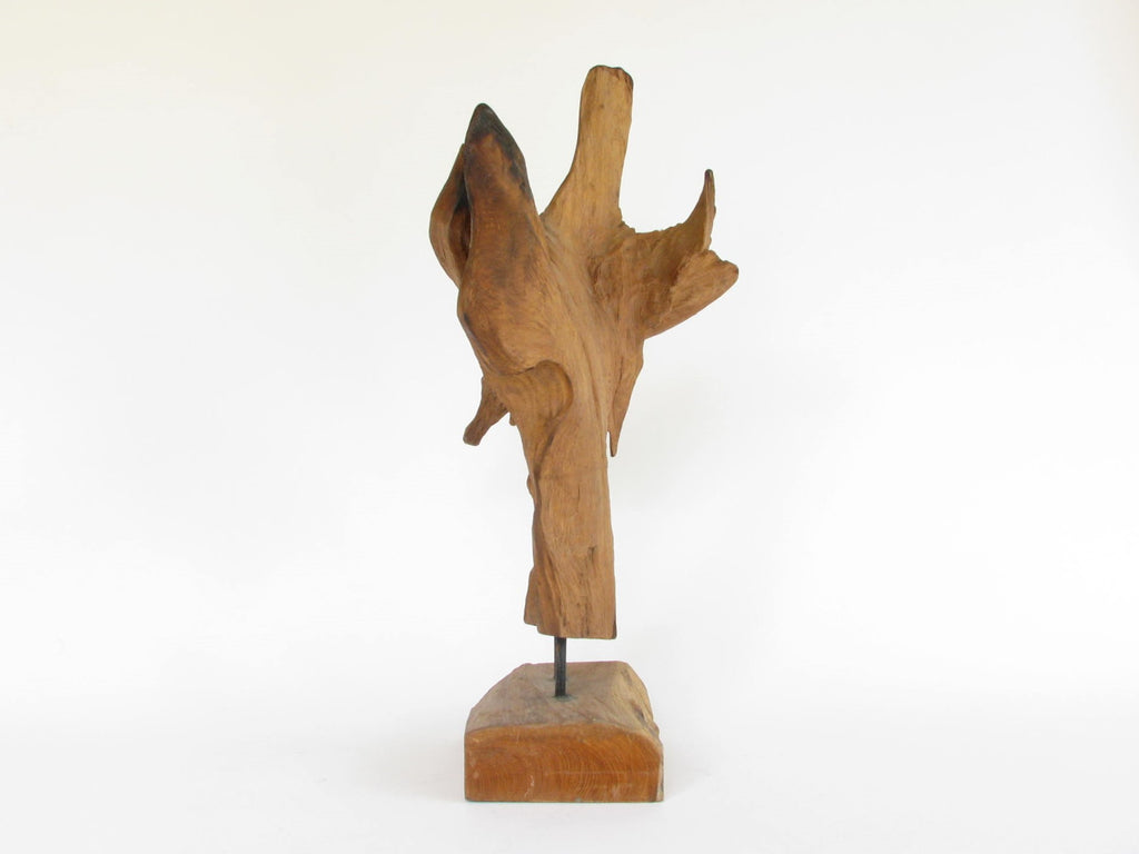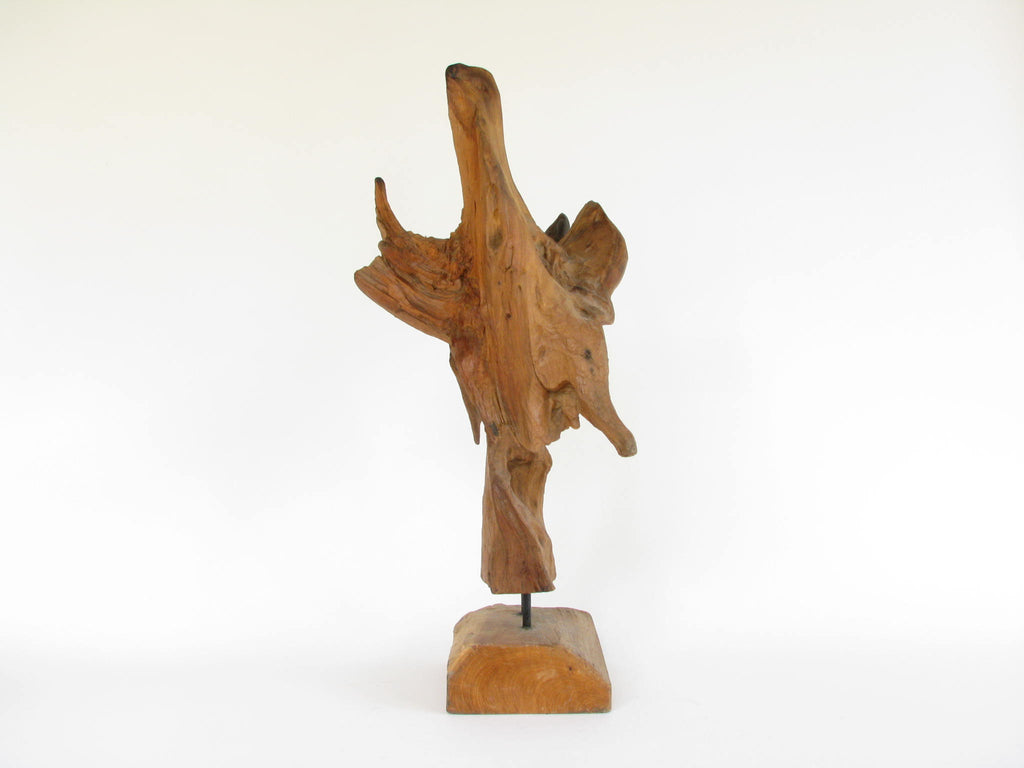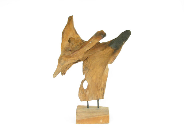 Hand carved driftwood sculpture with fitted hand blown glass vase or terrarium. Unique piece of art, fully hand-crafted. When we procured these there was a great deal of dust (which we have since cleaned off), leading us to believe that these items may be late 20th Century or early 2000s.