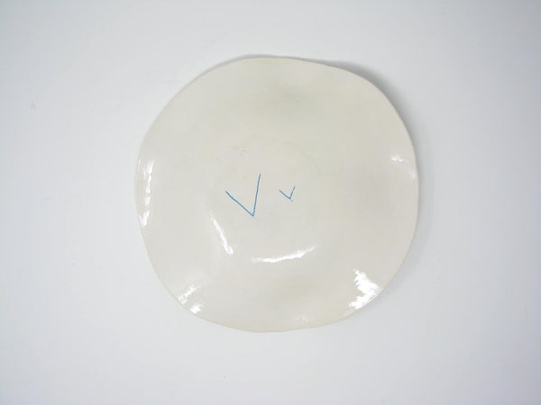 Organic shaped hand thrown pottery round decorative plate or trinket dish with turquoise web / net design. Signed by artist ViVi.