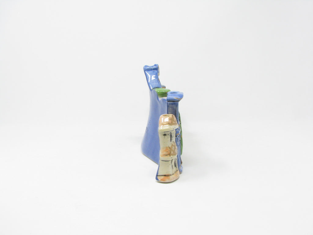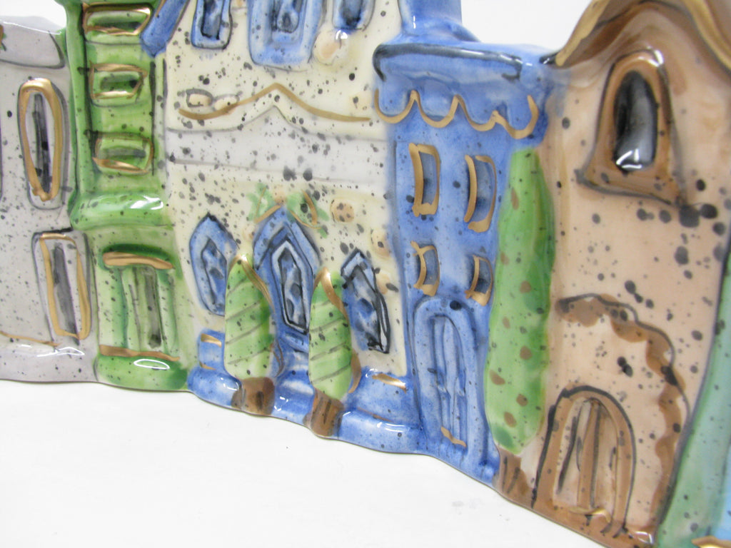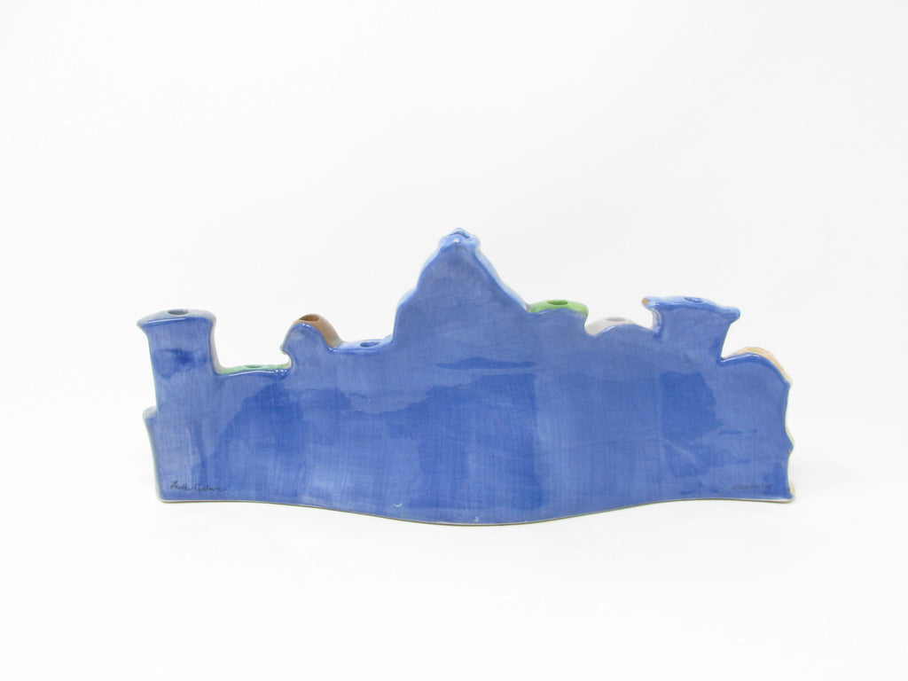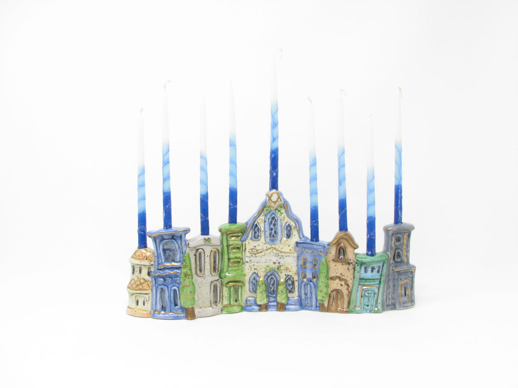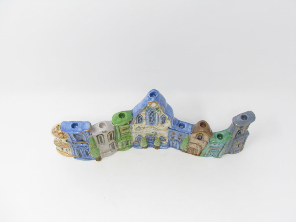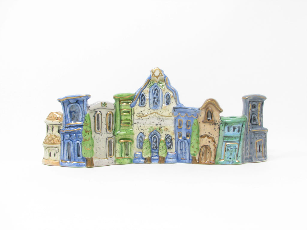 Blue Sky ClayWorks Pottery village shaped menorah / candle holder by Canadian potter Heather Goldminc. Candles not included.