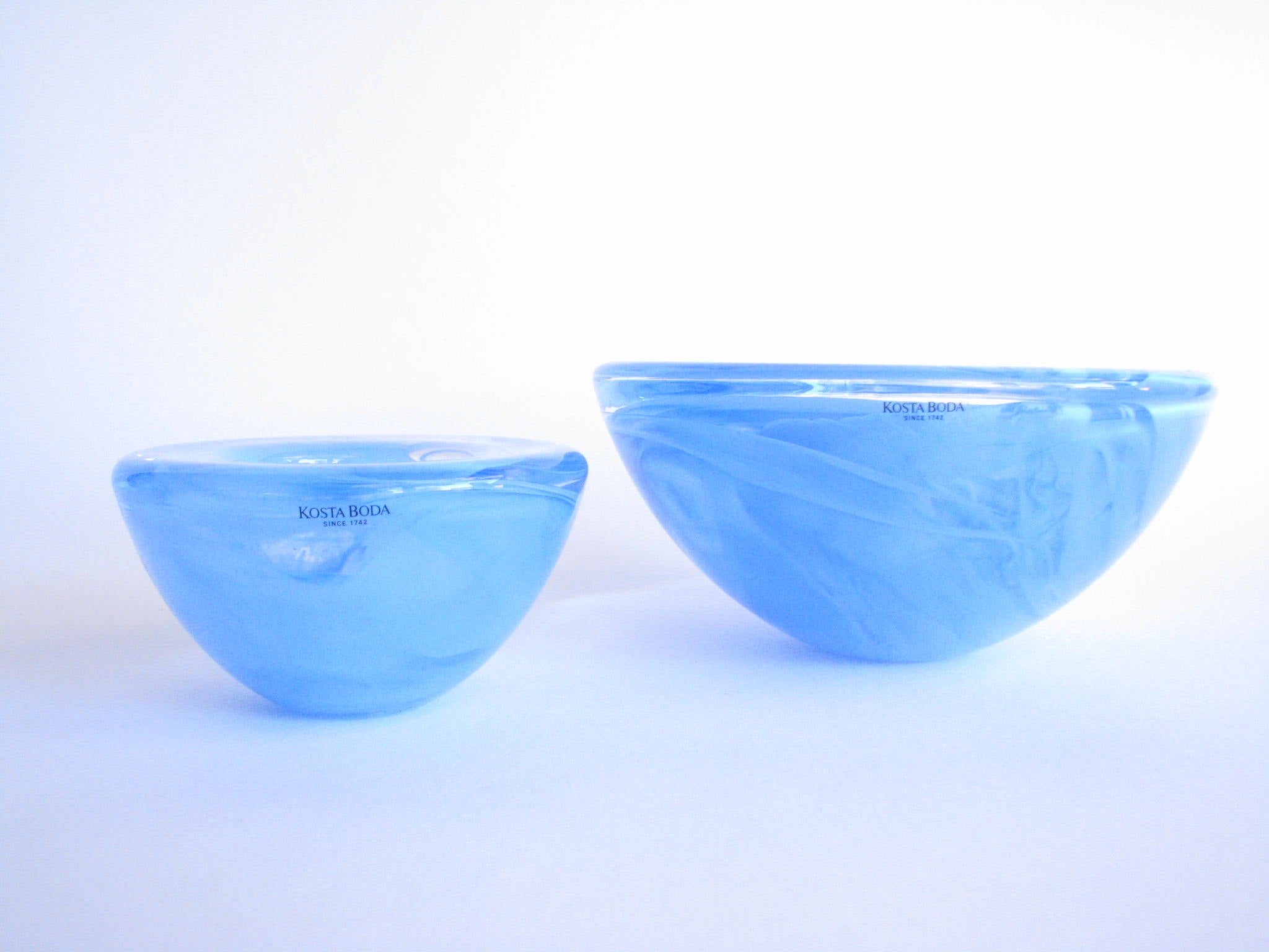 Kosta Boda Atoll art glass bowl & tealight holder set in light blue swirl design. Designed by Anna Ehrner for Kosta Boda and produced from 1997-2015. Original labels affixed, bottoms are acid etched 'Kosta Boda'.