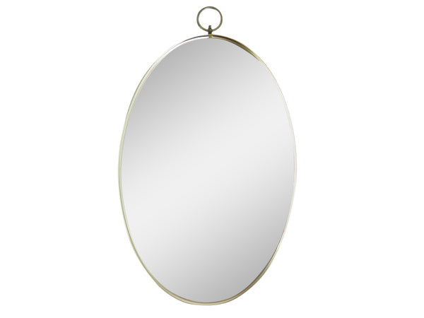 Beautiful mid-century modern oval polished brass mirror by Turner Manufacturing Co. (Chicago, IL). "A True Quality Fashion Plate Mirror". Clean polished brass accented by ring finial.