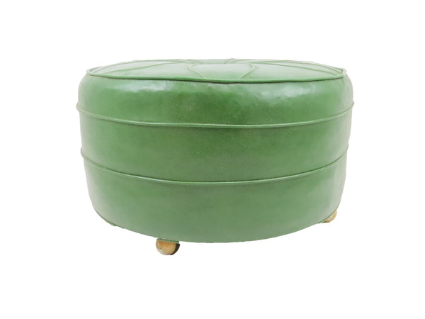 Mid-century modern green vinyl ottoman with double top stitching by Babcock Phillips. On rolling casters. For the truest color please see the close-up photo.