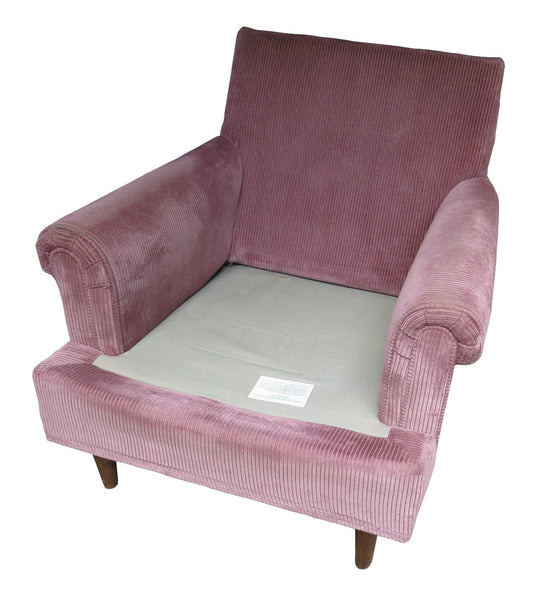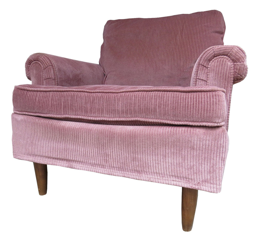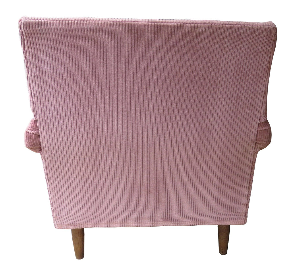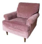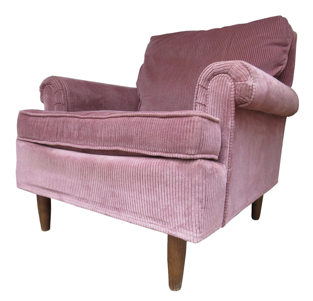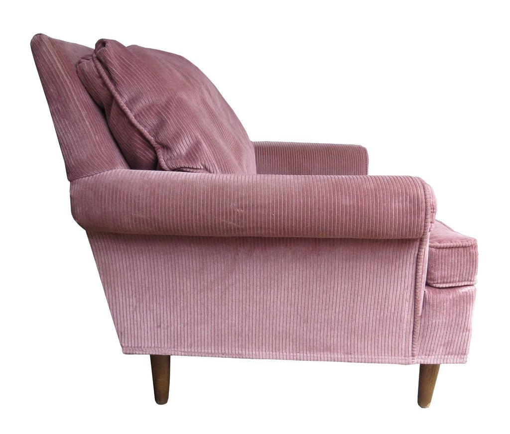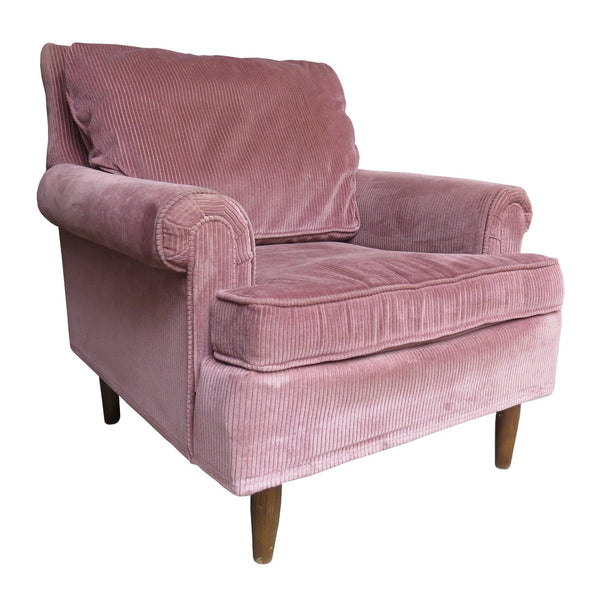 Pink corded velvet lounge chair by W. & J. Sloane. Loose back and seat cushions with solid walnut tapered legs. Cozy and comfortable.