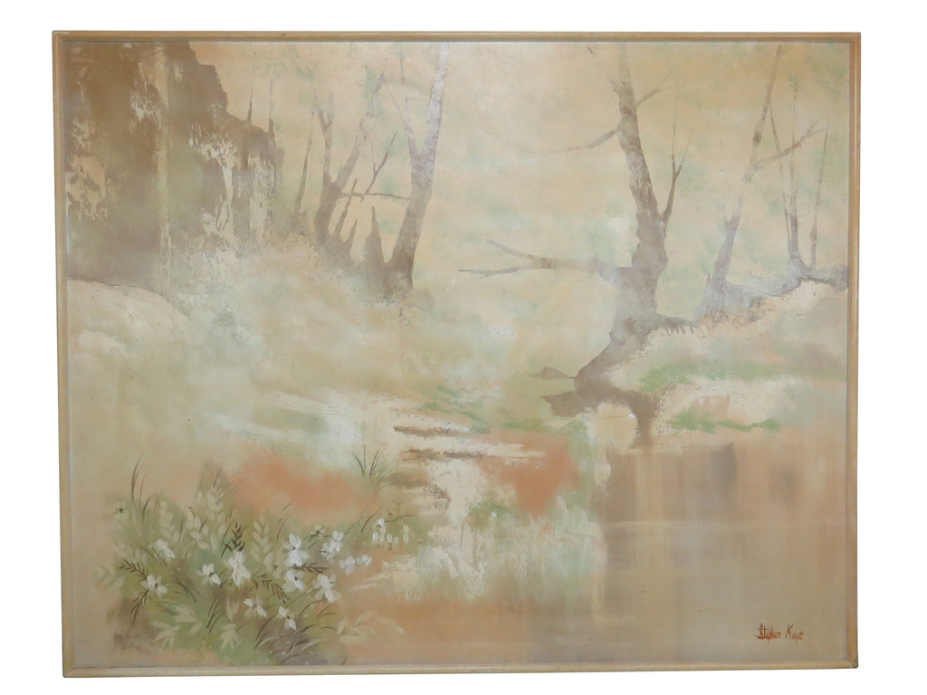 Large mid 20th Century oil on canvas abstract landscape by listed artiest Stephen Kaye. Stephen Kaye is known primarily for producing large-scale oil paintings depicting abstracted floral still life and landscapes.