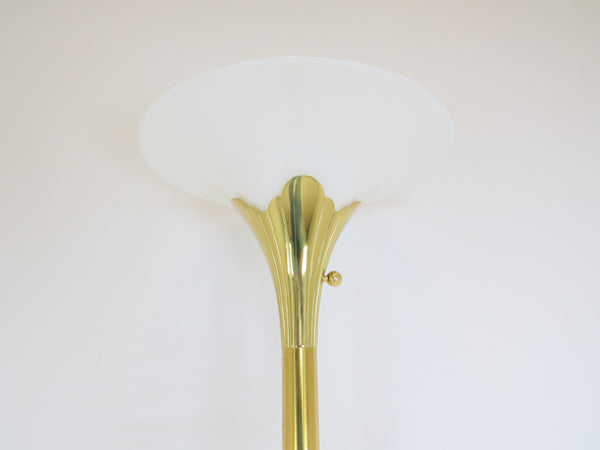 Stiffel Art Deco inspired brass lily-shaped torchiere floor lamp with lotus blossom base. Lamp features original opal glass flair shade with working dimmer switch. Attributed to Tommi Parzinger who designed for Stiffel in the mid 20th Century. Glass shade sits atop the lily blossom neck.