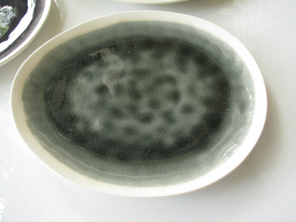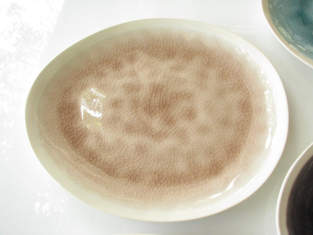 Contemporary Gaia Ravella egg-shaped stoneware dinner plates. Part of the Bella Terra series, these dinner plates have an organic shape, deep tones, and sharp contrasts. There are 7 plates in this set: Green Thyme (2), Blue Seafoam (2), Dusty Blueberry / Gray (1), Petal / Rose (2).
