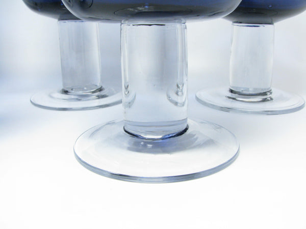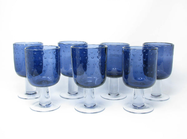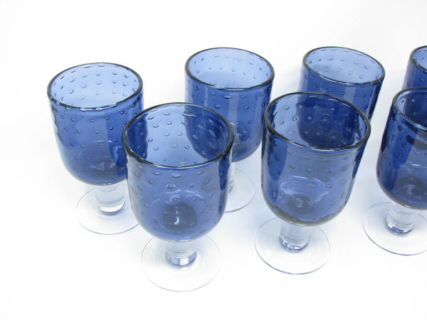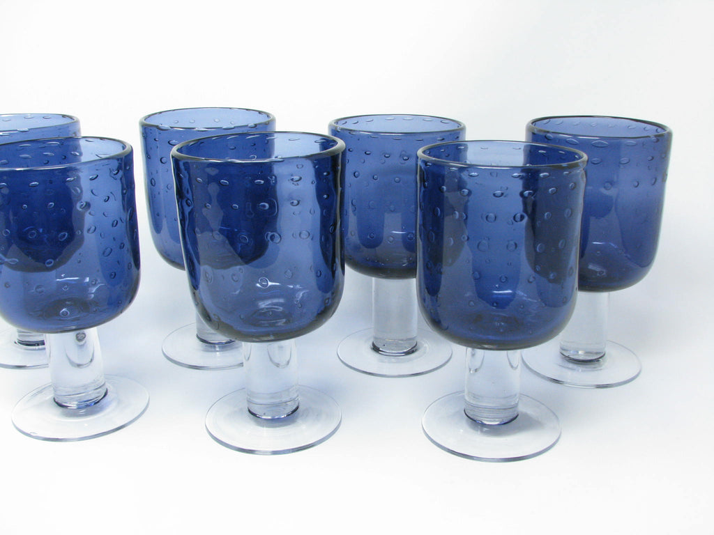 Beautiful set of 7 purple glass goblets with seeded / bubble glass bowl and thick, transparent stem and foot.
