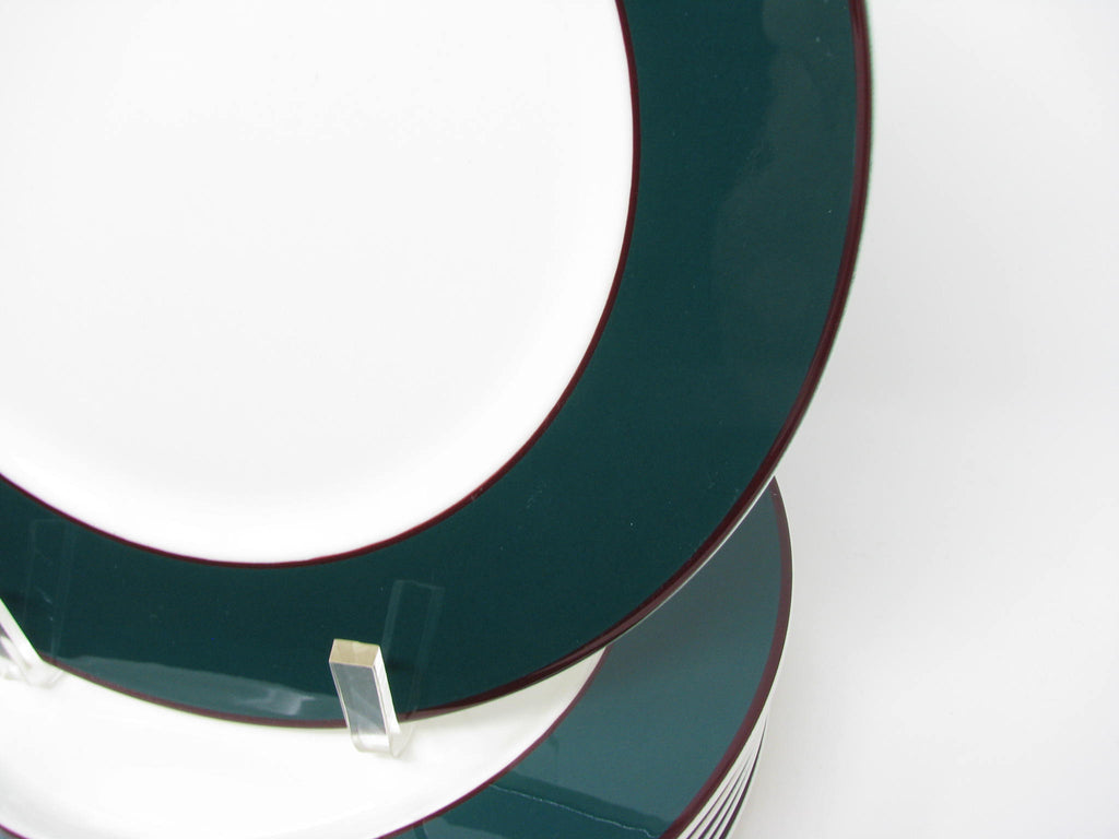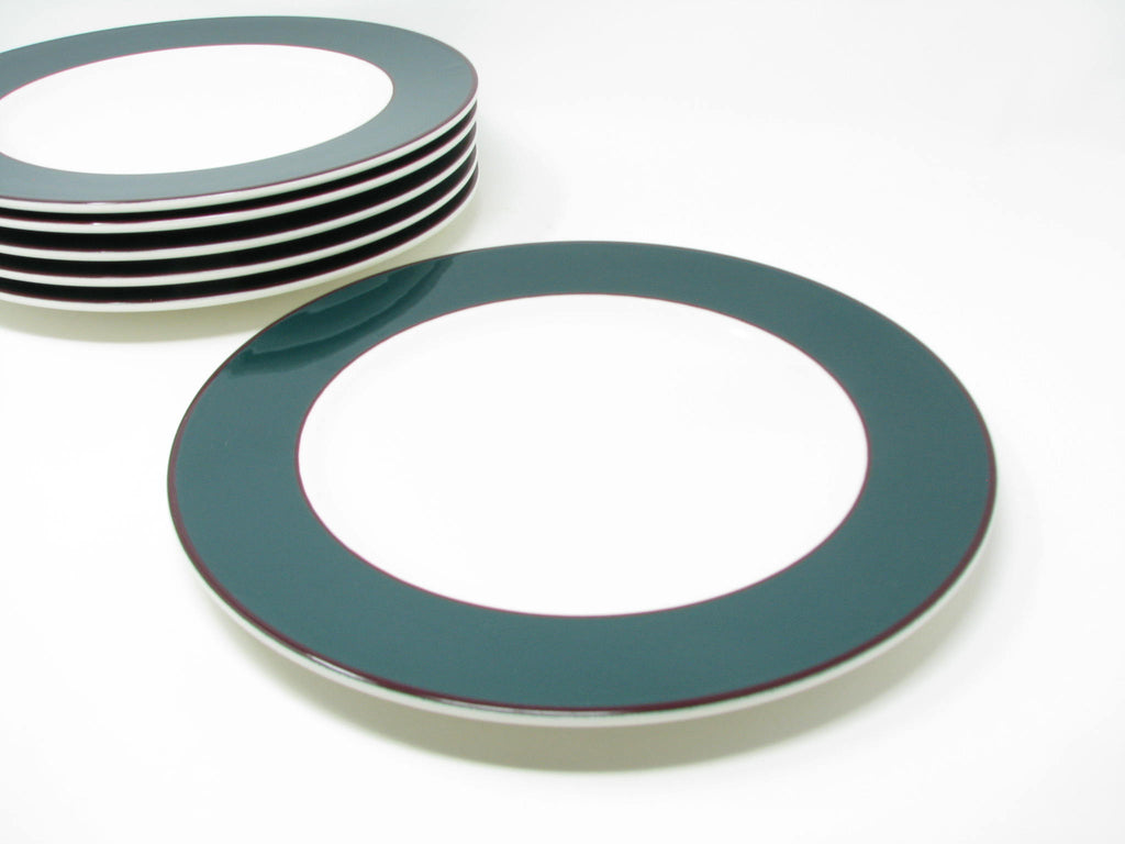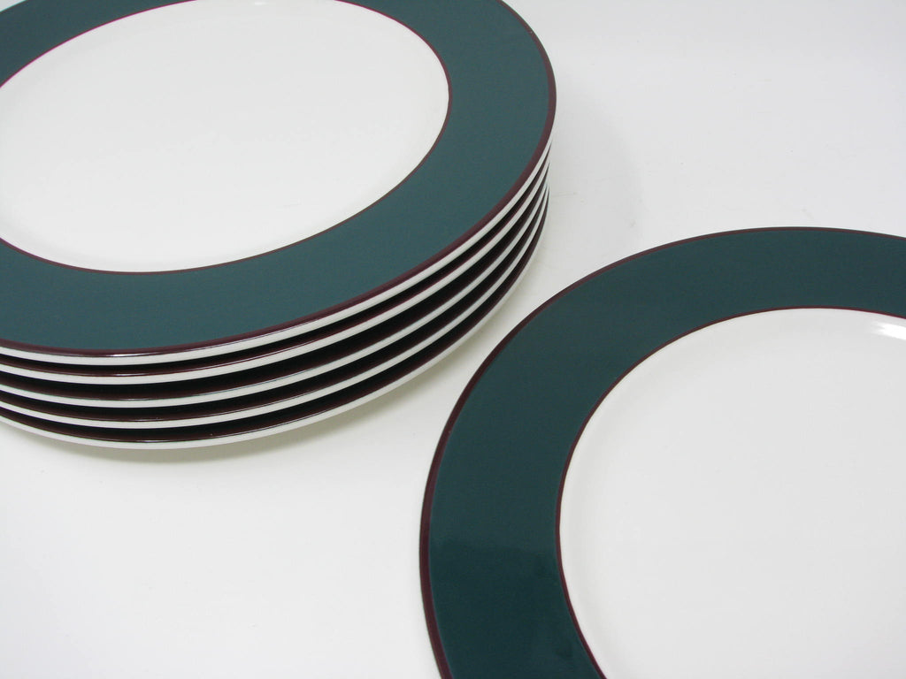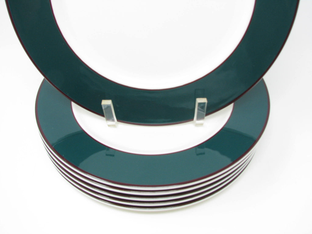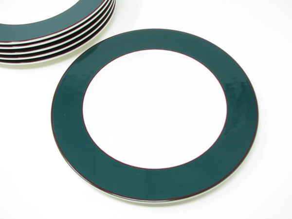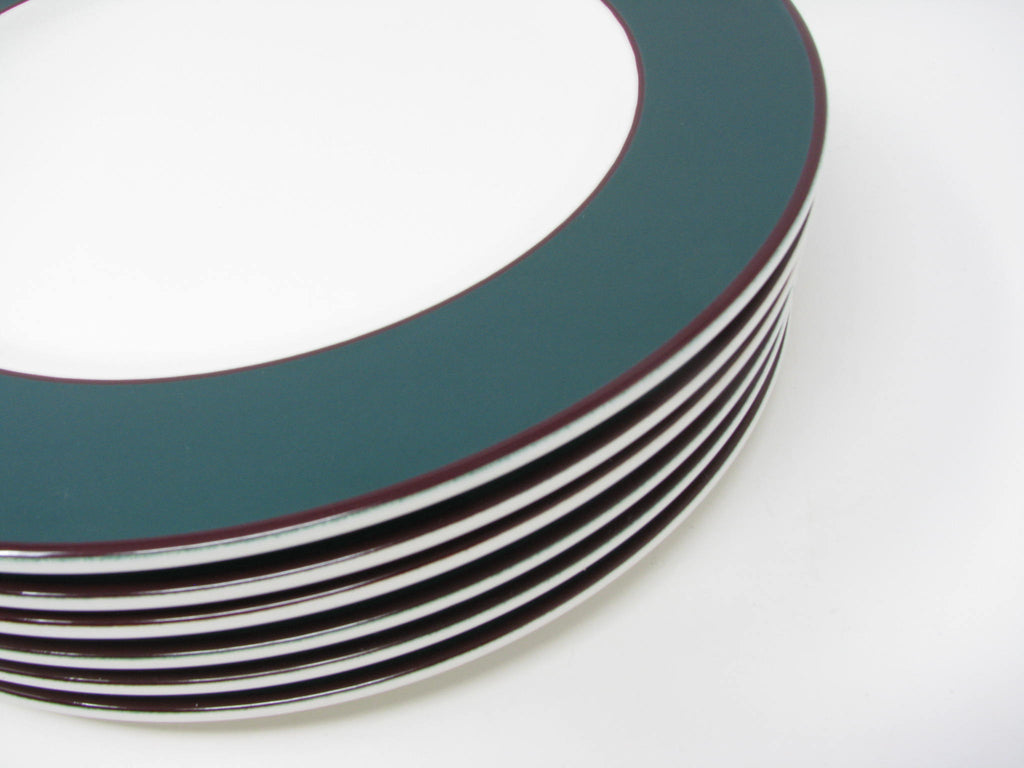 Set of 6 Pagnossin dinner plates with maroon band and green trim.