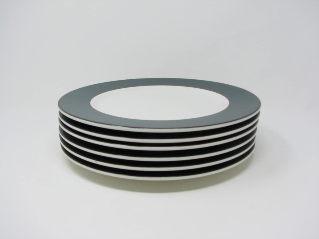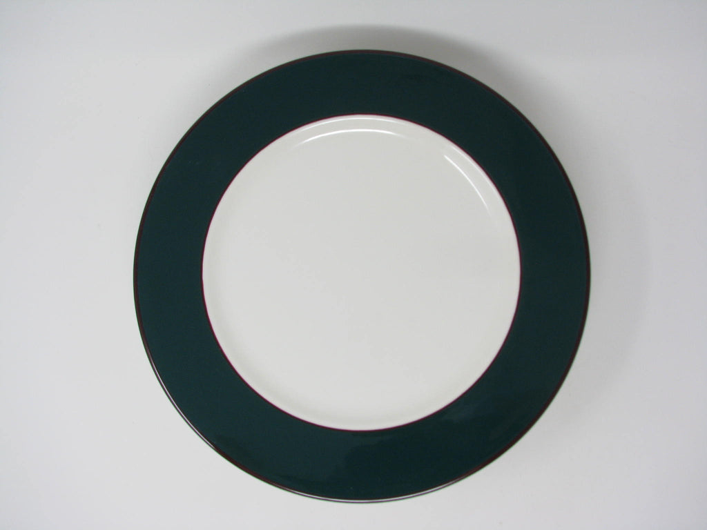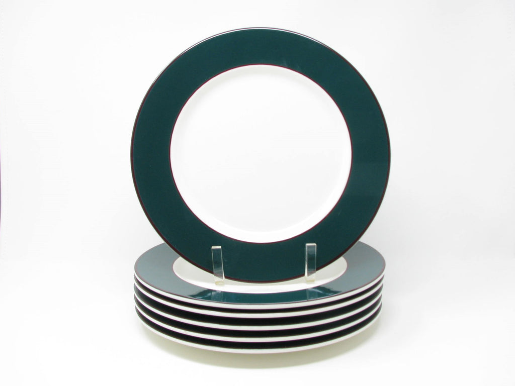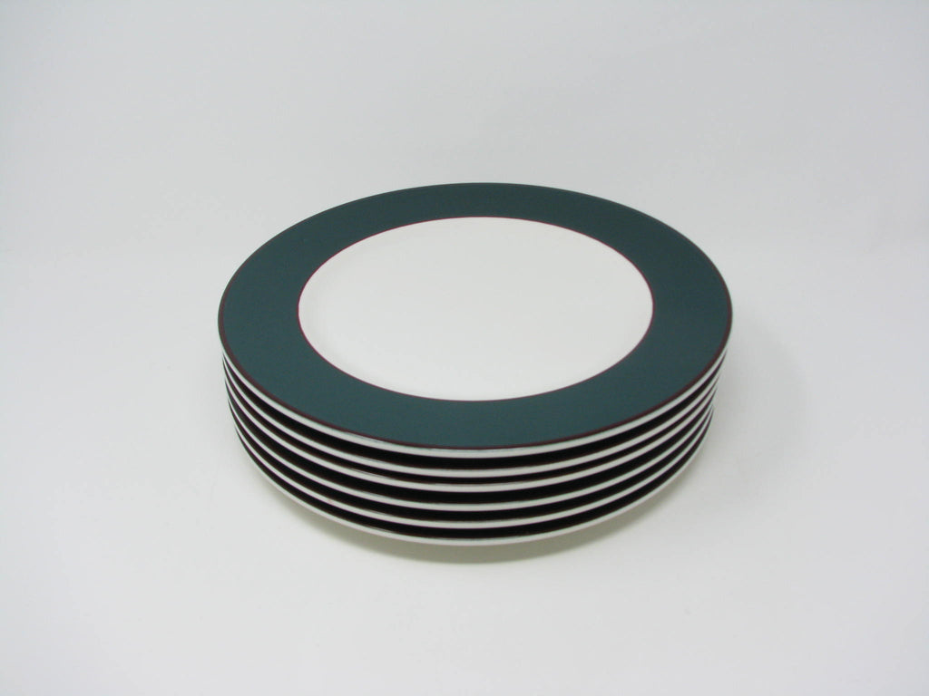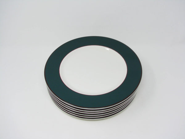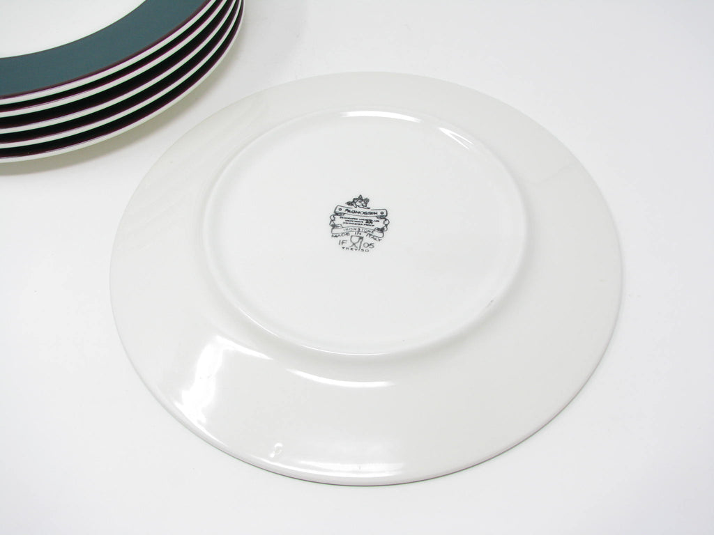 Set of 6 Pagnossin dinner plates with maroon band and green trim.
