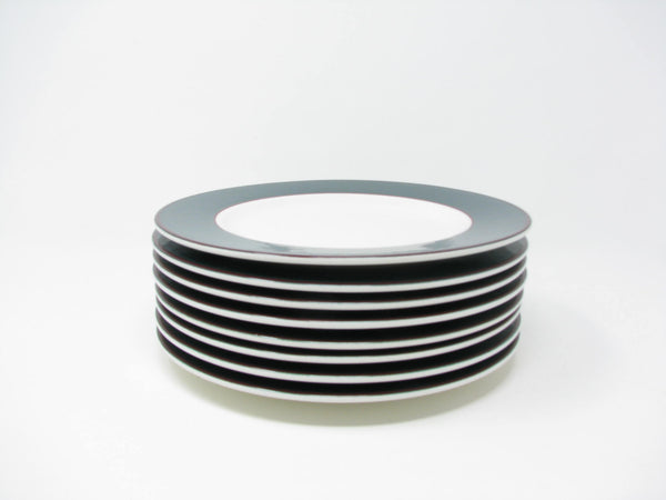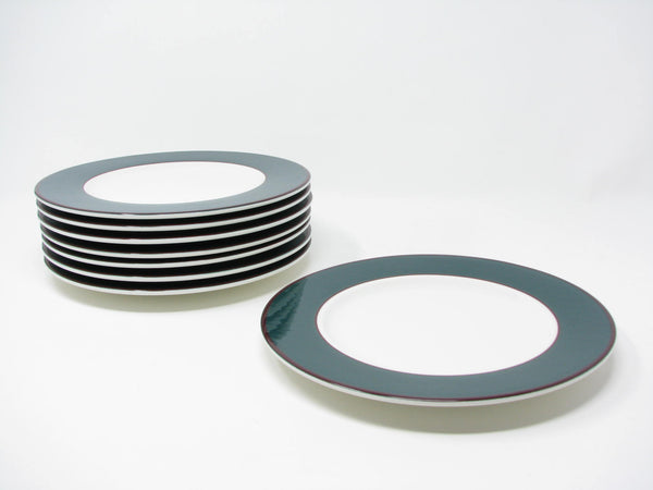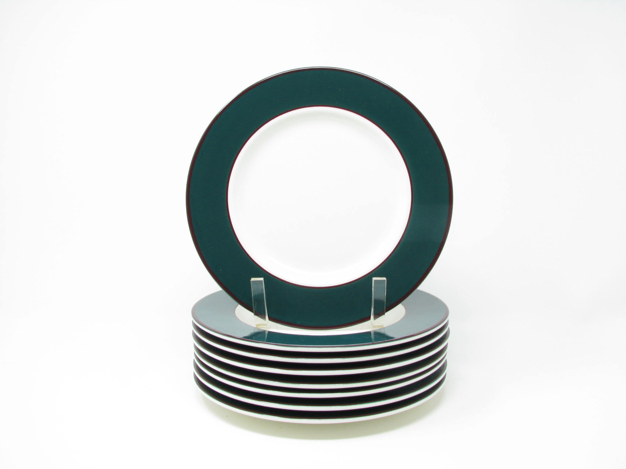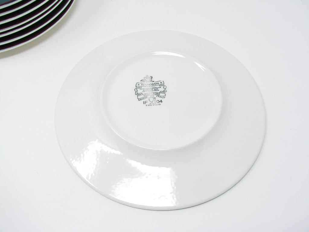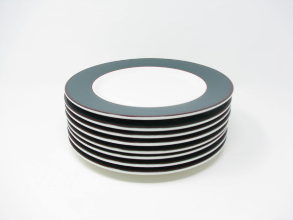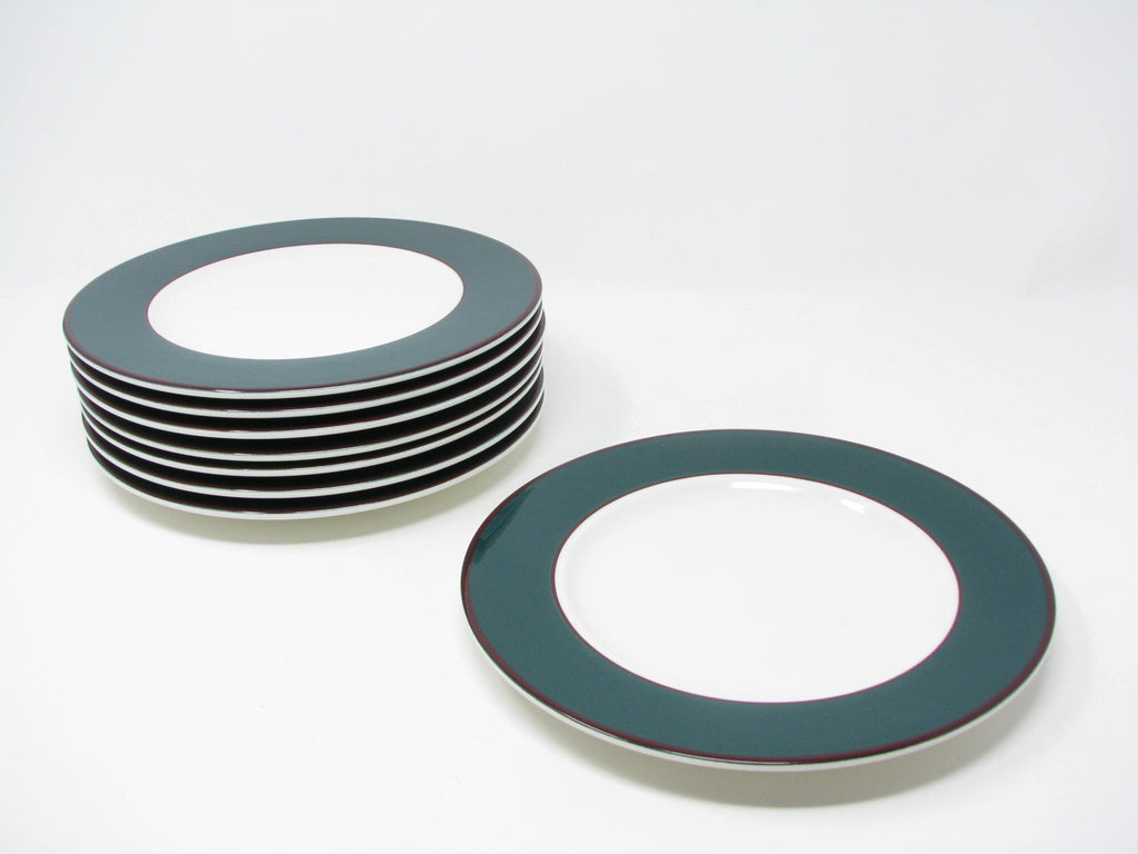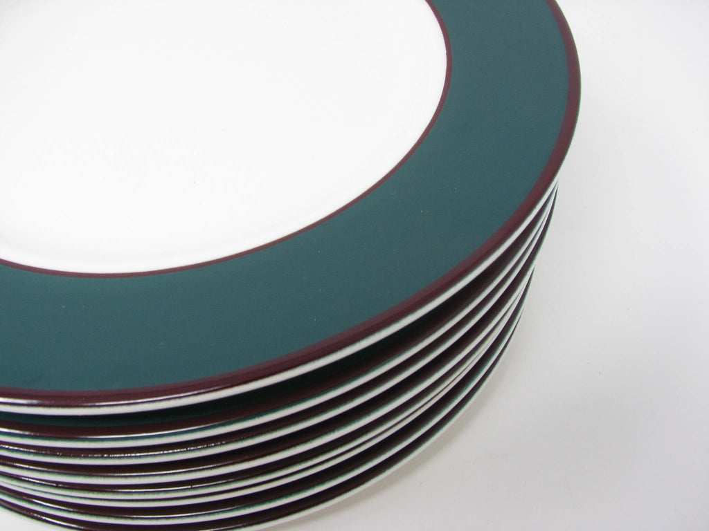 Set of 8 Pagnossin salad plates with maroon band and green trim.