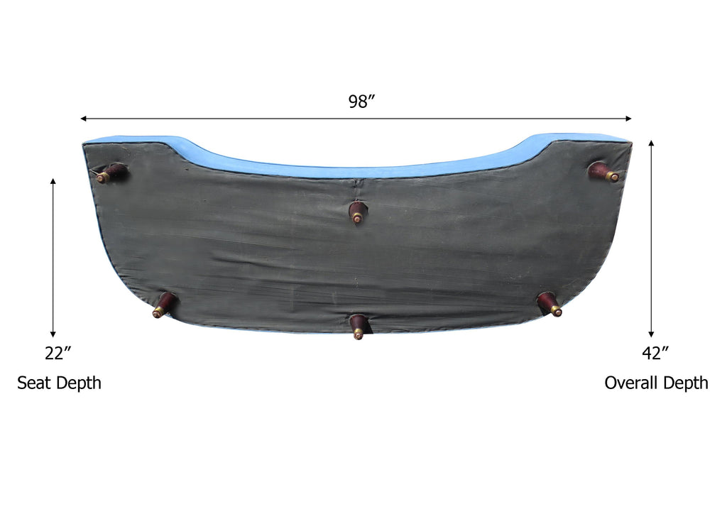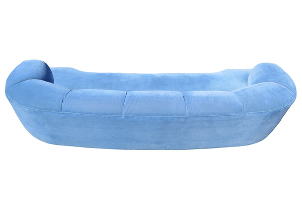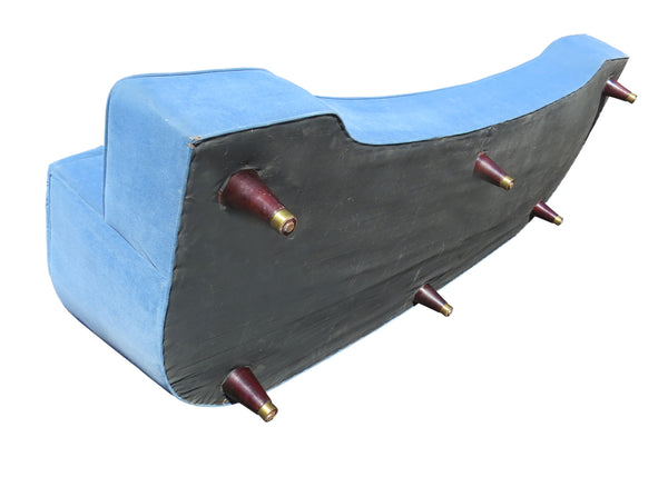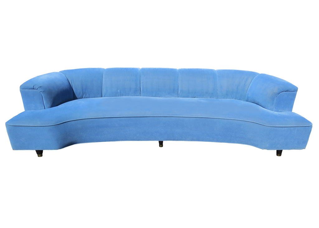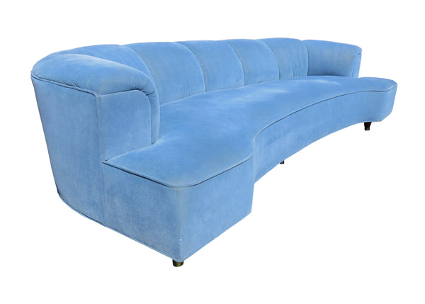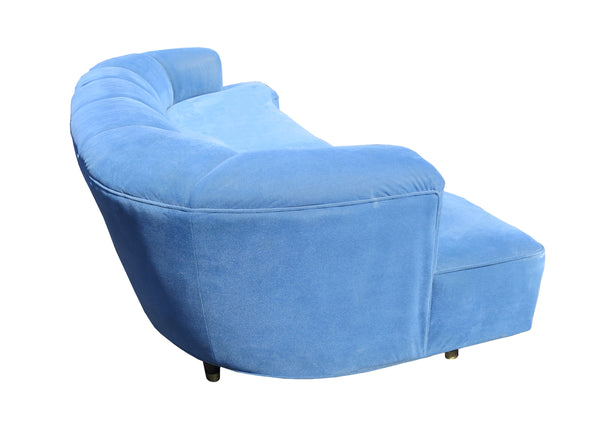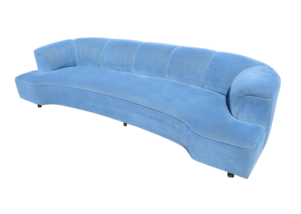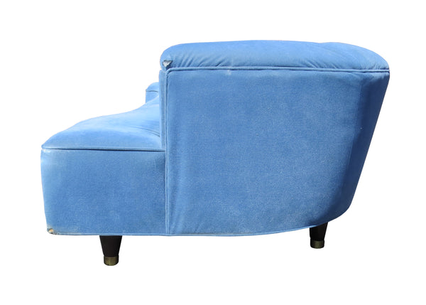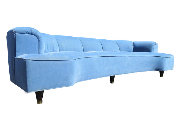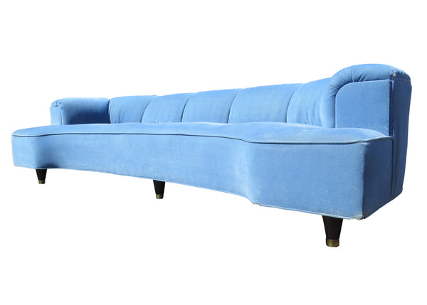 Stunning 1930's French Art Deco D-shaped (Oasis) curved sofa with scalloped back. This low streamlined sofa features six solid mahogany legs with brass caps / sabots. Inner coil springs give this sofa a nice subtle crown with a very comfortable bounce. Upholstered at a later date using a light sky blue synthetic mohair.