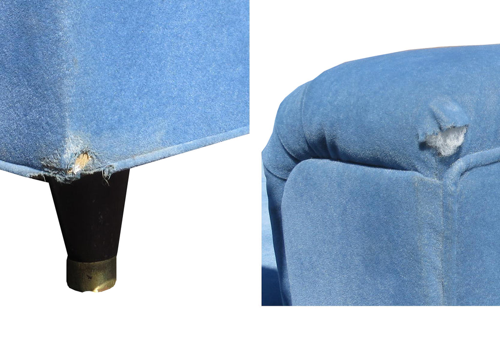 Damage or Points of Notice: Some wear and minor tear on fabric. Please see close-up photos for details. Some hairline scratches on top of seat. Condition and wear appropriate with age and use.