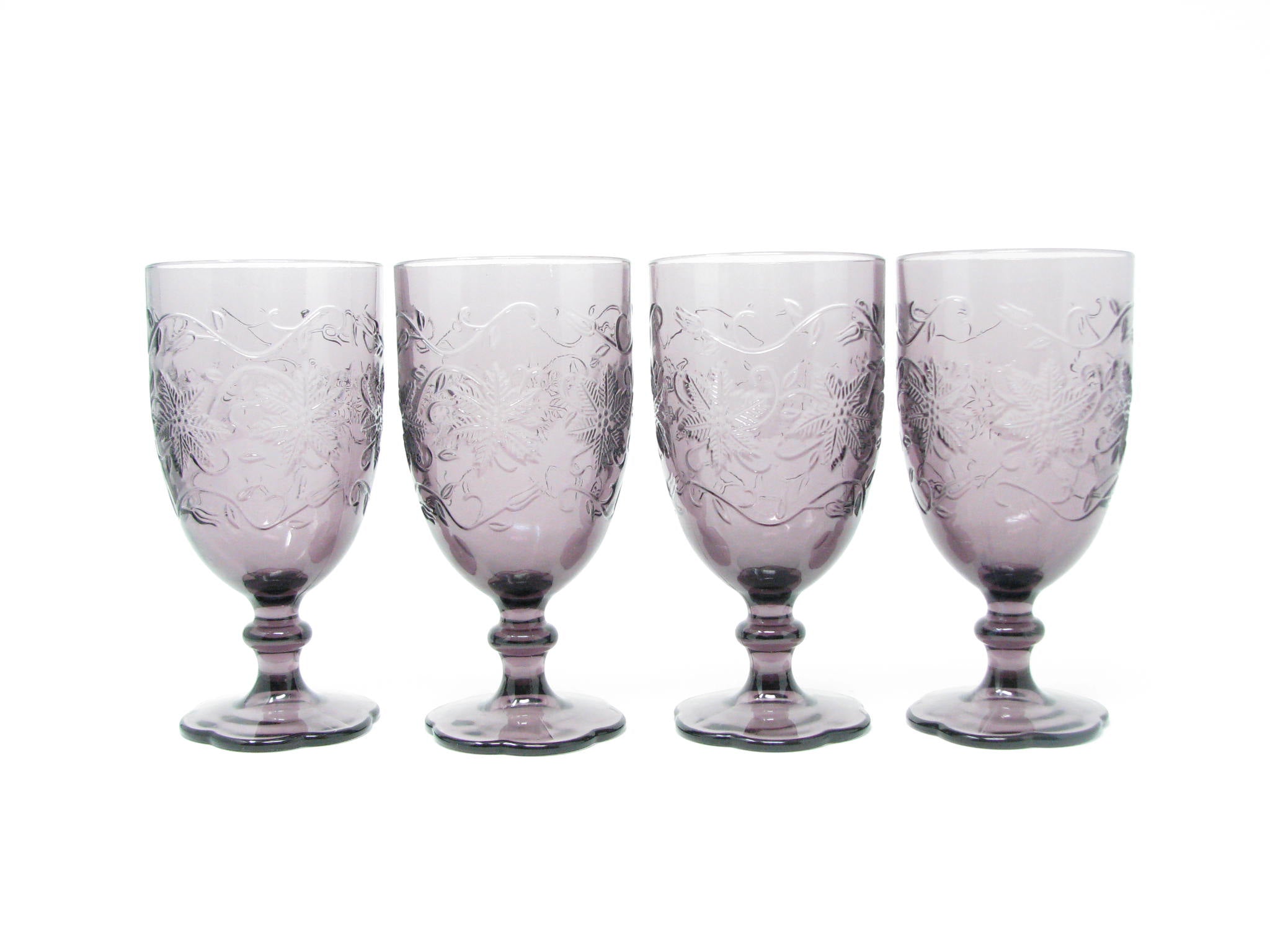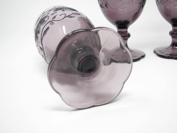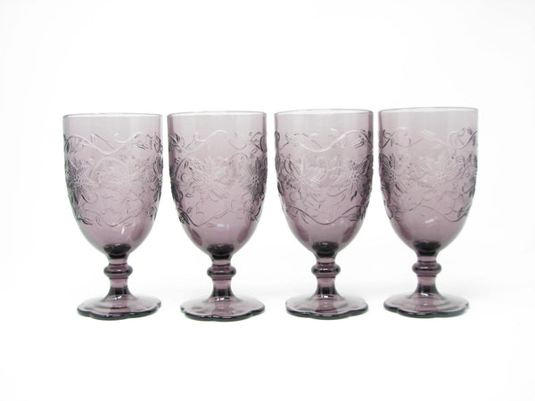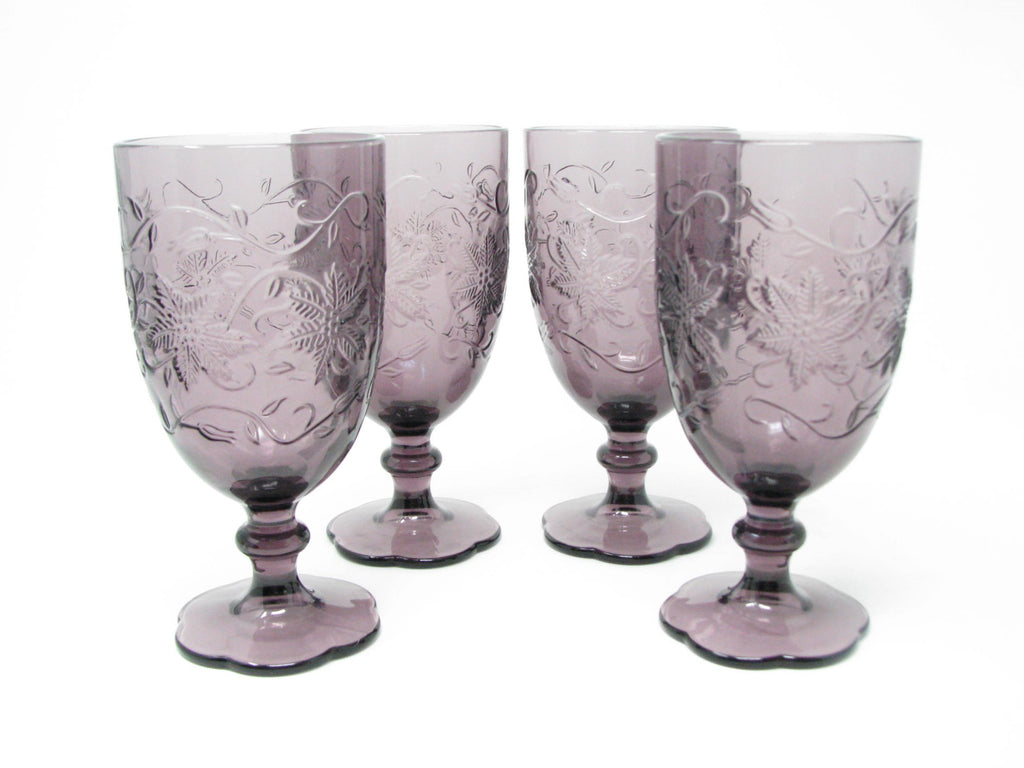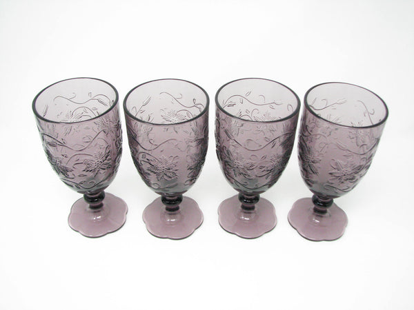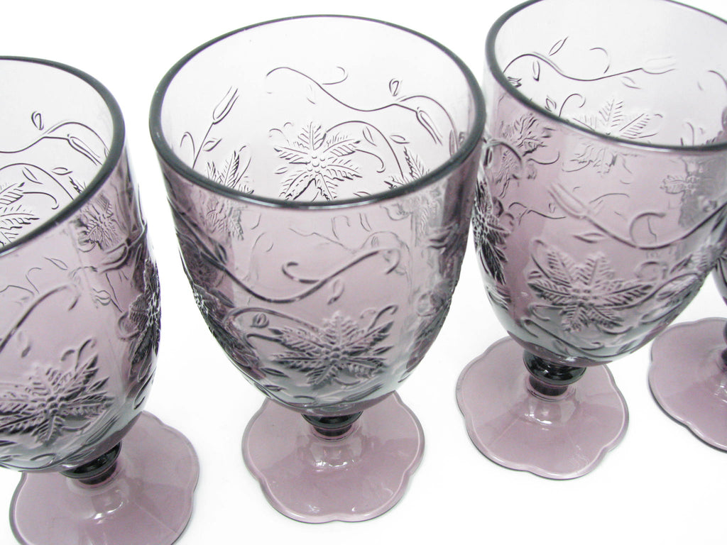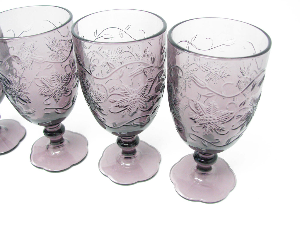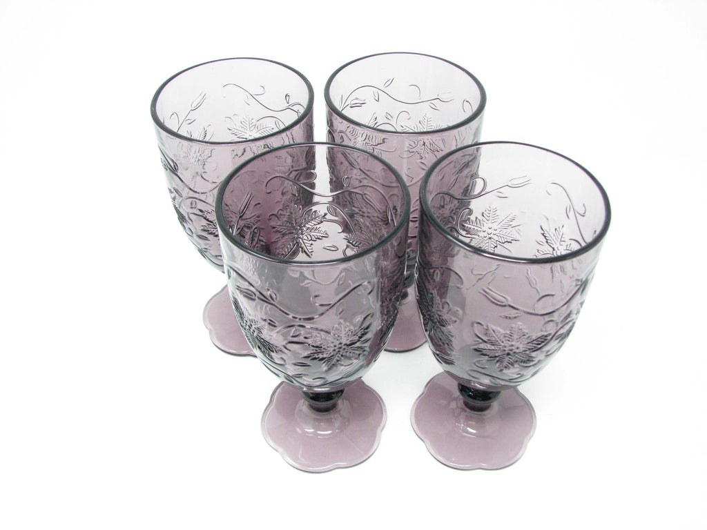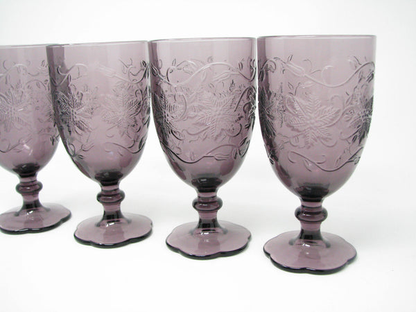 Princess House Fantasia Amethyst purple pressed glass water goblets with floral / poinsettia design. Set of 4.