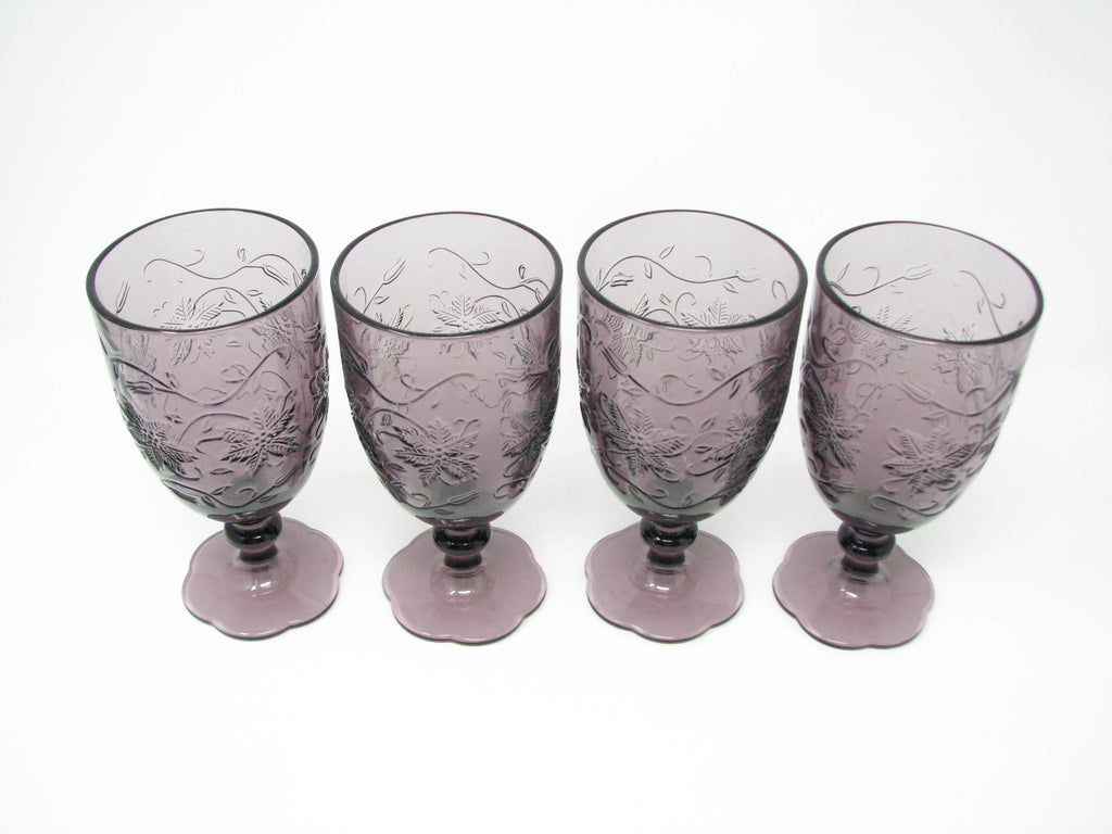 Princess House Fantasia Amethyst Purple Glass Goblets with Floral Poinsettia Design - Set of 4