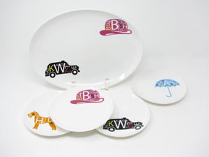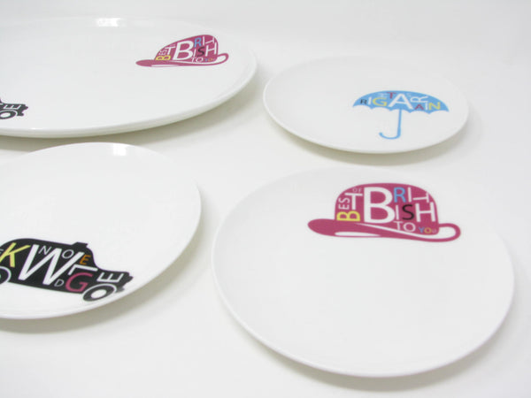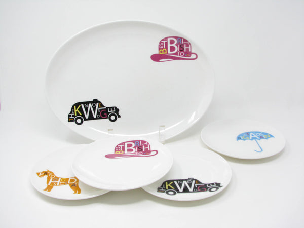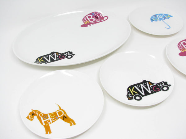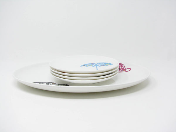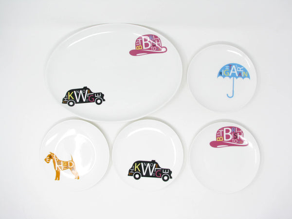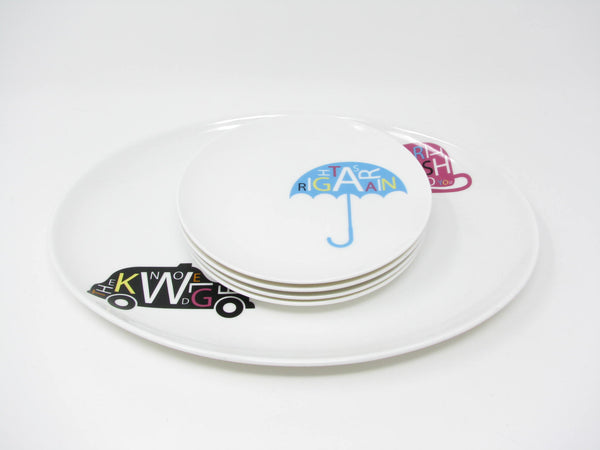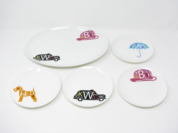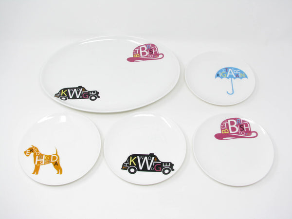 Royal Doulton Pop in For Drinks happy hour dish set with colorful 1950's style designs. This 5 piece set includes 1 large platter and 4 small appetizer or dessert plates. Made in England.