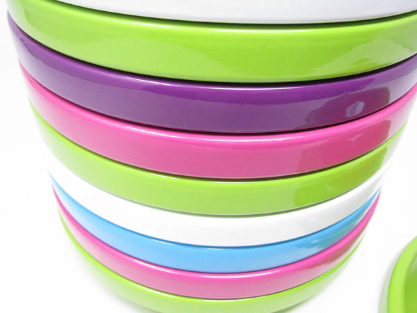 Vibrant set of 12 powder-coated terracotta pot saucers made in Germany by Ceramano (Spag). Use with your favorite potted plants, or line with a piece of parchment or foodservice paper and serve tacos, pizza, or snacks. Although these items are free of harmful or impairing substances for consumers, it is not recommended to eat directly off of these (For more information see: https://spang.de/en/clay-in-contact-with-foodstuff/).