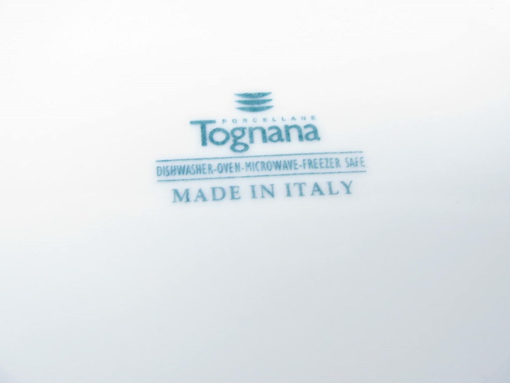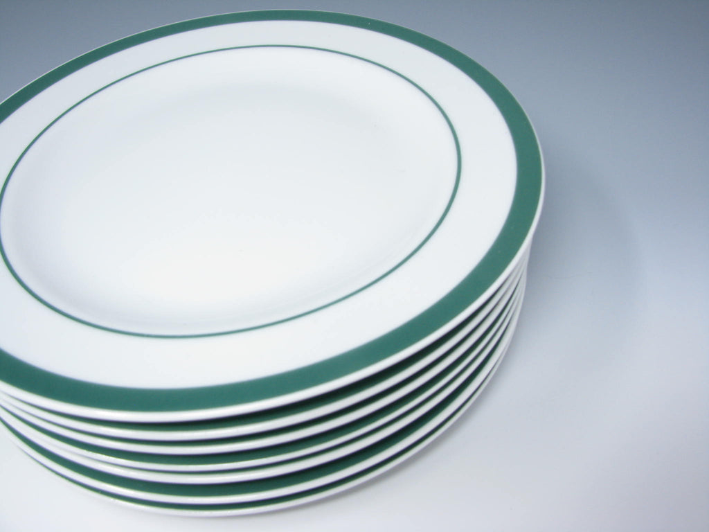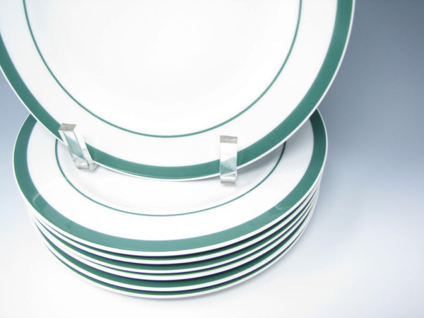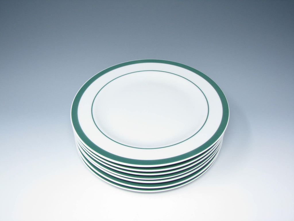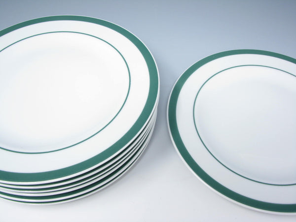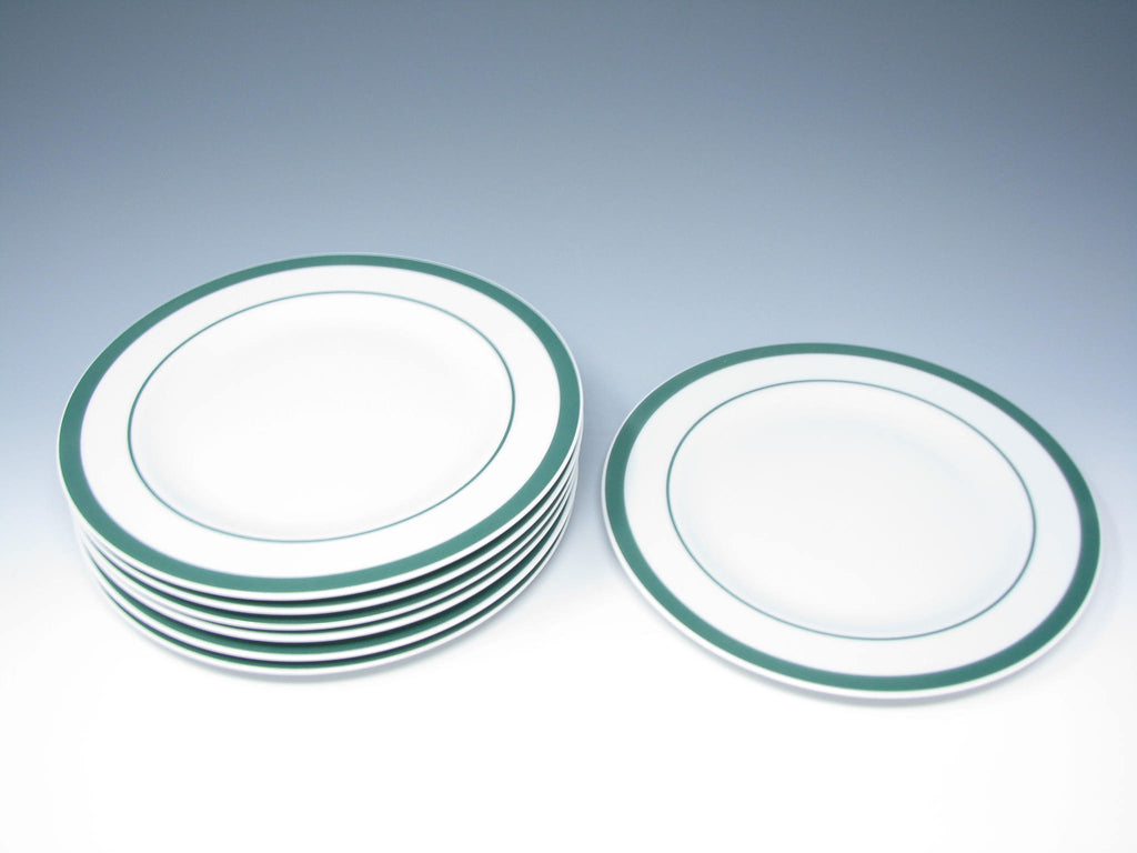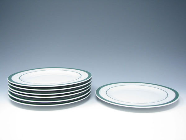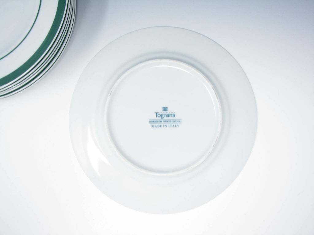 Set of 7 Tognana porcelain salad plates with green trim made in Italy.