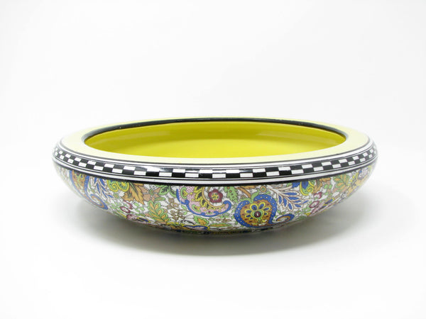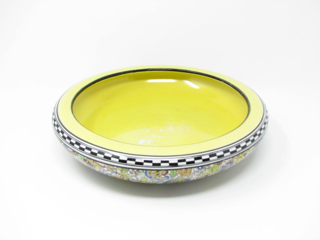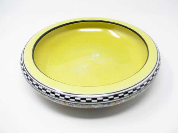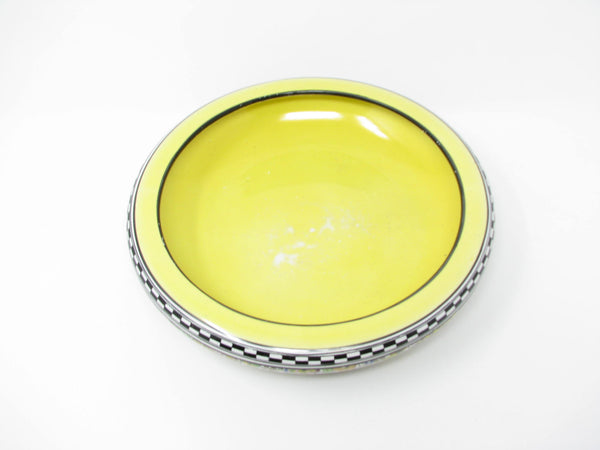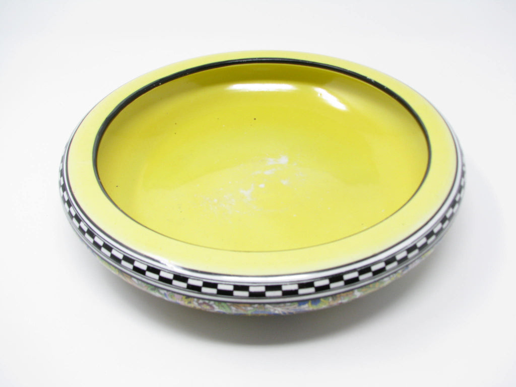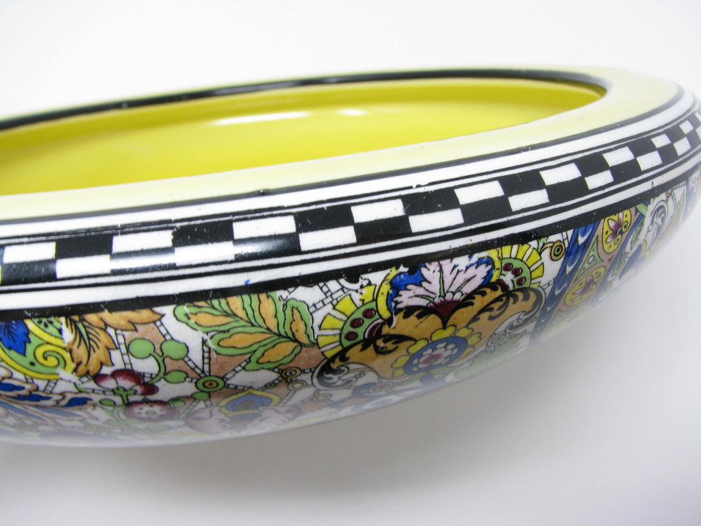 Vintage 1930s Royal Winton Ware Grimwades transferware centerpiece or console bowl with stunning yellow interior and checkboard / paisley pattern around body.