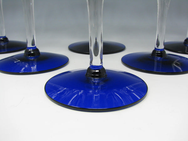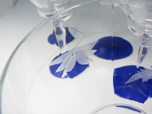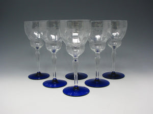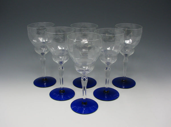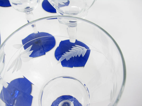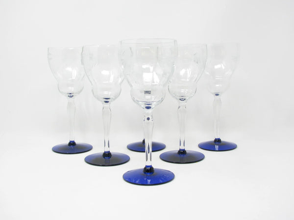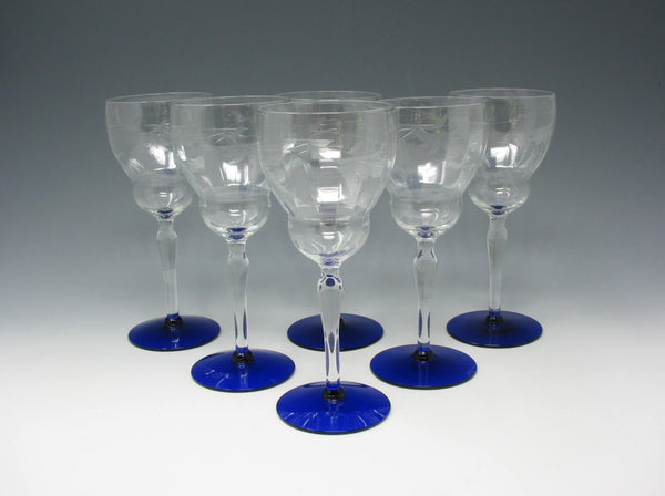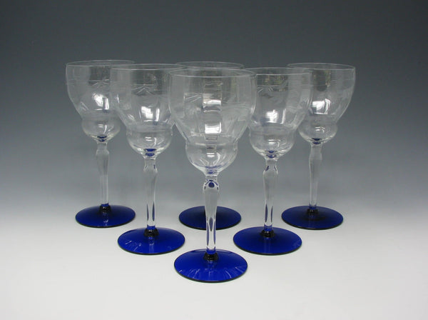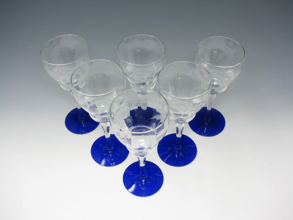 Vintage 1930s Weston Cut Glass Water or Wine Goblets with Leaves & Floral Pattern, Cobalt Foot - 6 Pieces