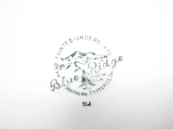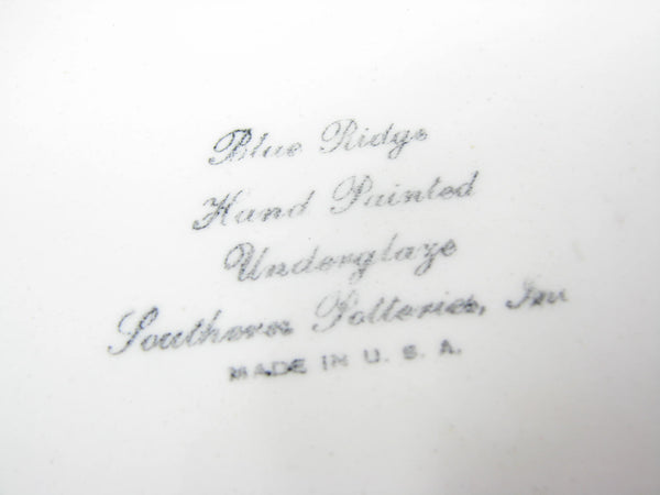 Blue Ridge is a brand and range of American tableware (dishware) manufactured by Southern Potteries Incorporated from the 1930s until 1957. Well known in their day for their underglaze decoration and colorful patterns, Blue Ridge pieces are now popular items with collectors of antique dishware. The underglaze technique made the decorations more durable, and while basic patterns were reused consistently, the fact that each piece was hand-painted means that no two pieces are exactly alike. (Excerpt from Wikipedia)