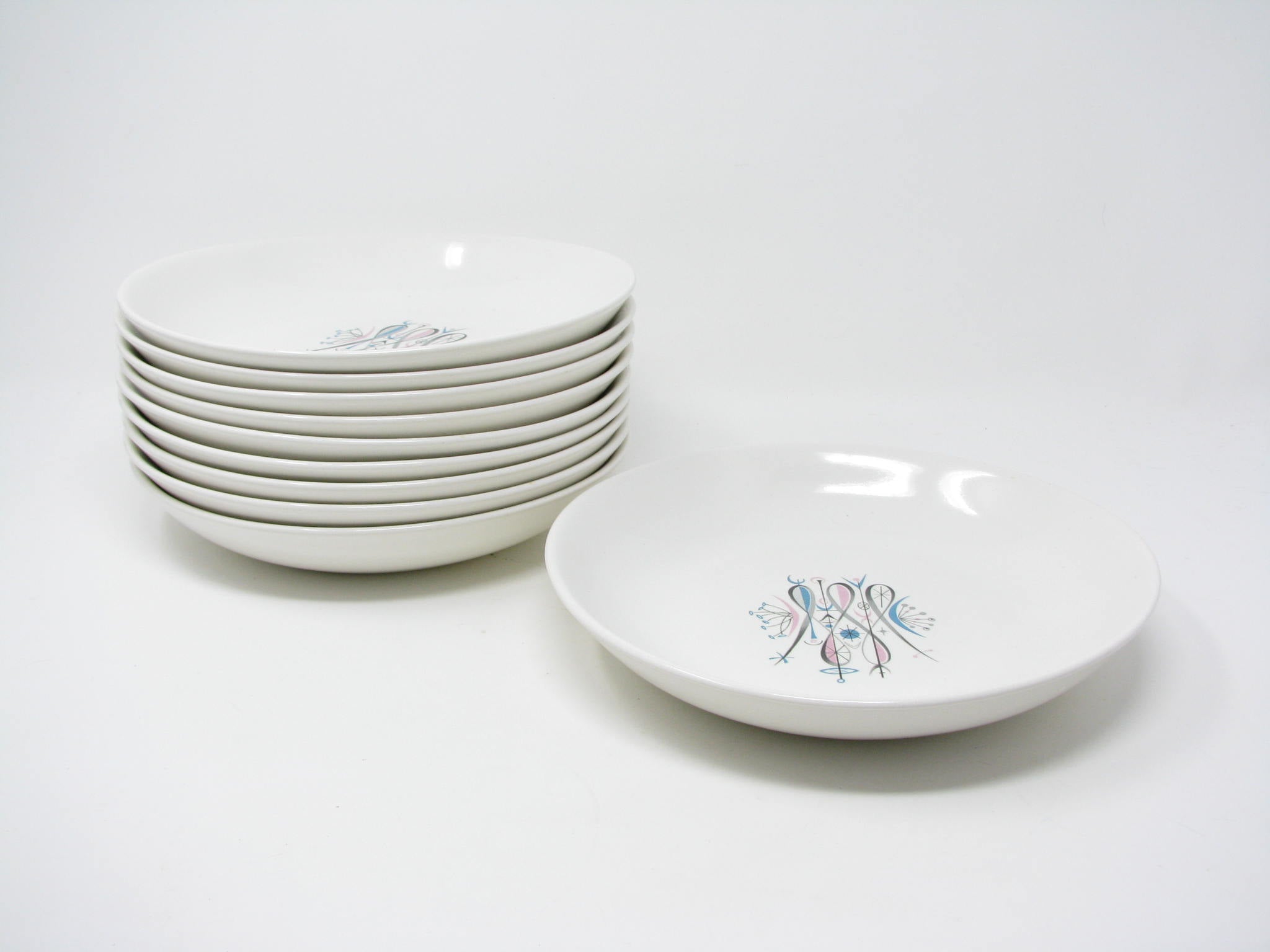 Rare vintage 1950's Paden City Pottery bowls with atomic Calligraphy pattern designed by Anton Refregier. Set includes 10 bowls.