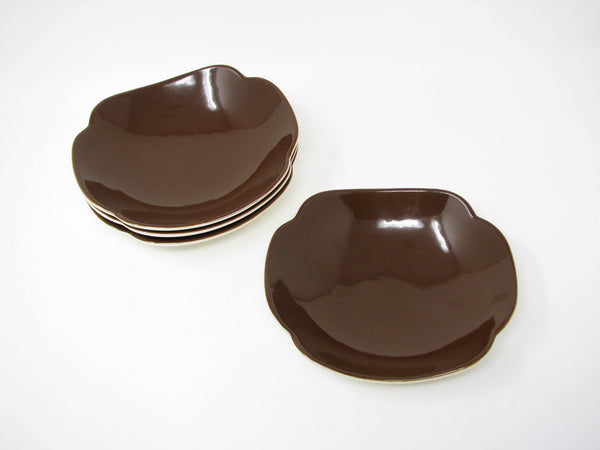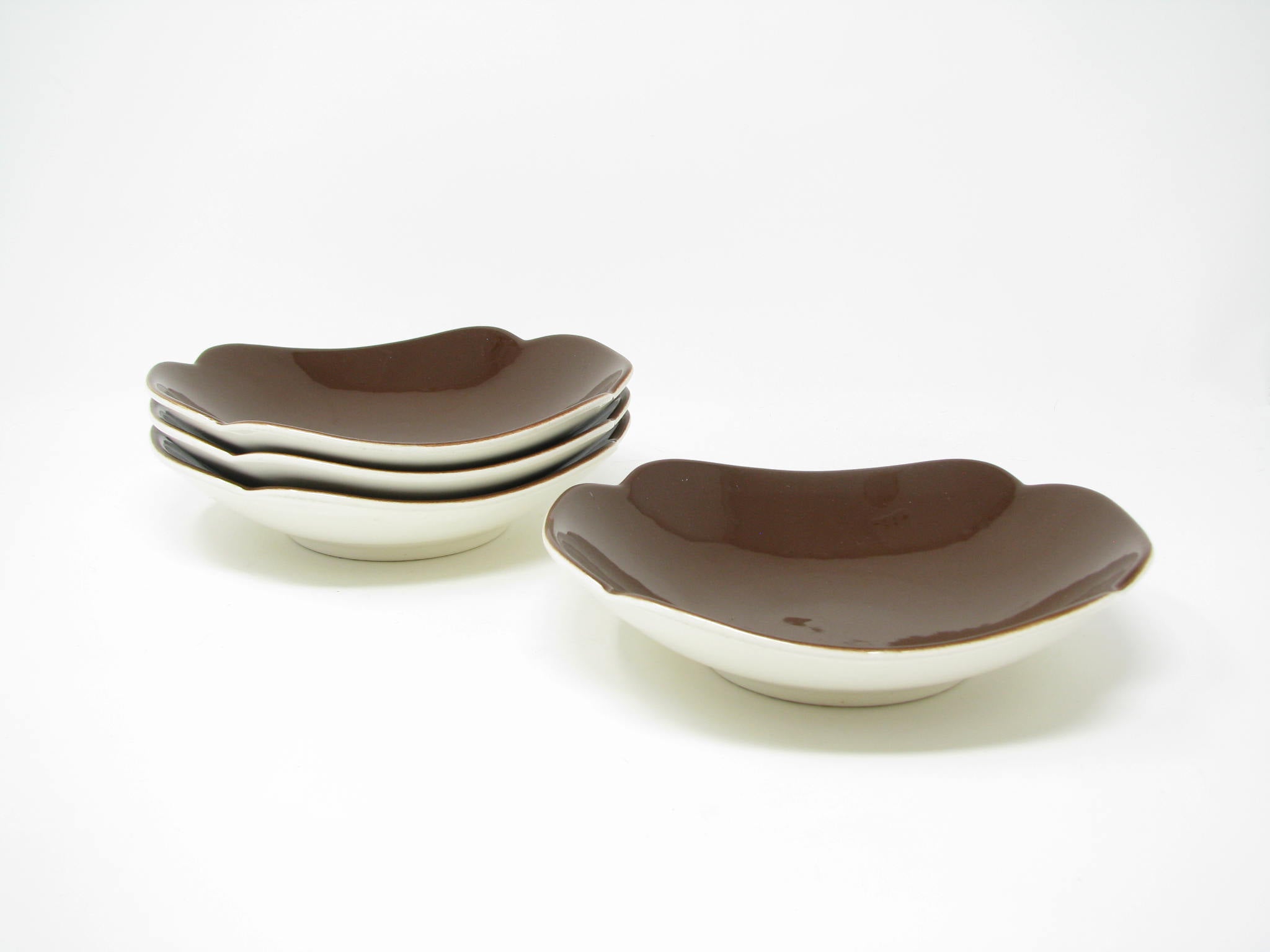 Vintage set of 4 Continental Kilns Woodleaf bowls with hand-painted brown interior. Continental Kilns was a pottery company in Chester, West Virginia which operated from 1944 until 1957.