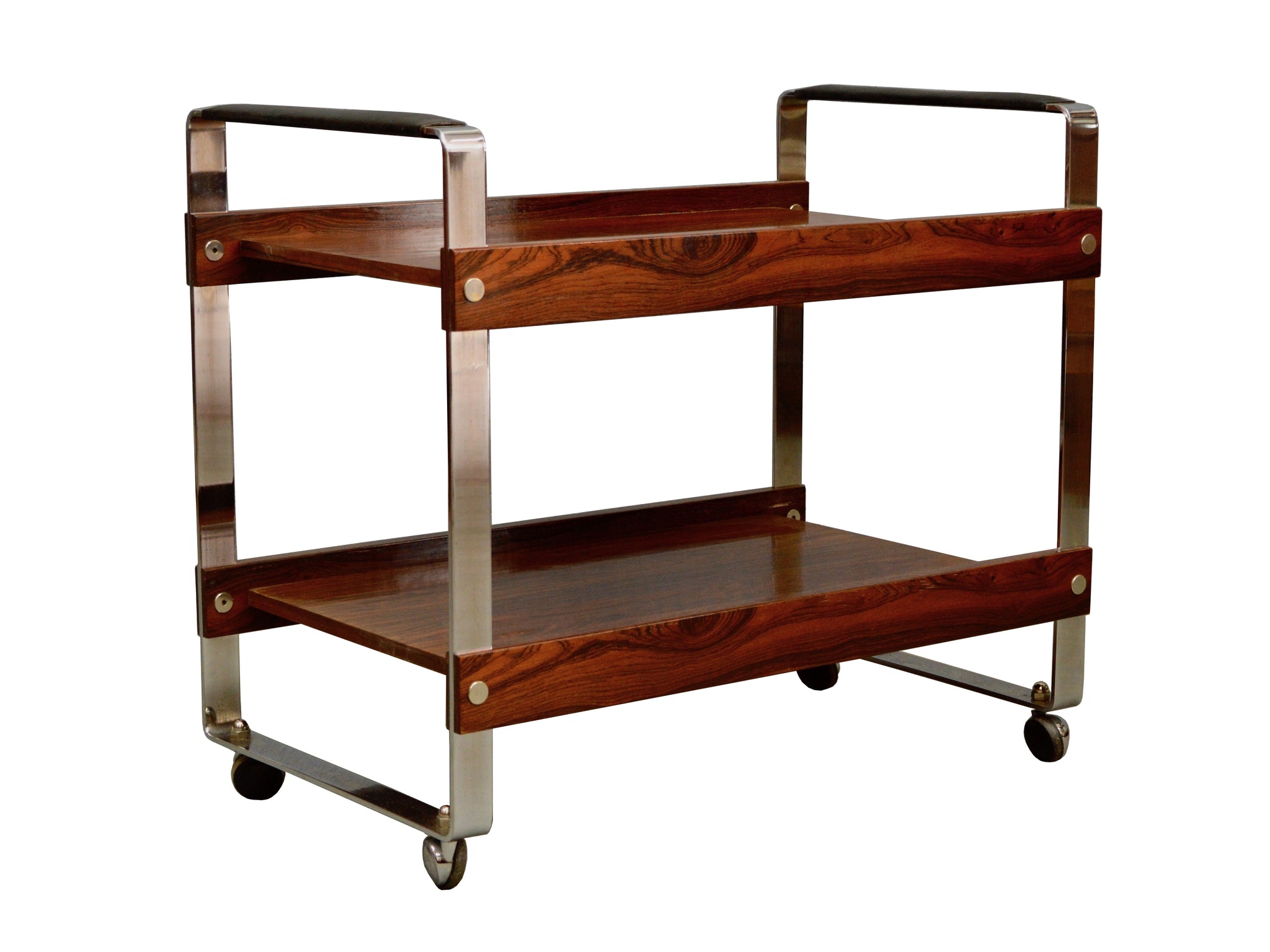 Vintage 1950s Mid-Century Modern Merrow Associates Chrome Rosewood & Leather Bar Cart Trolley