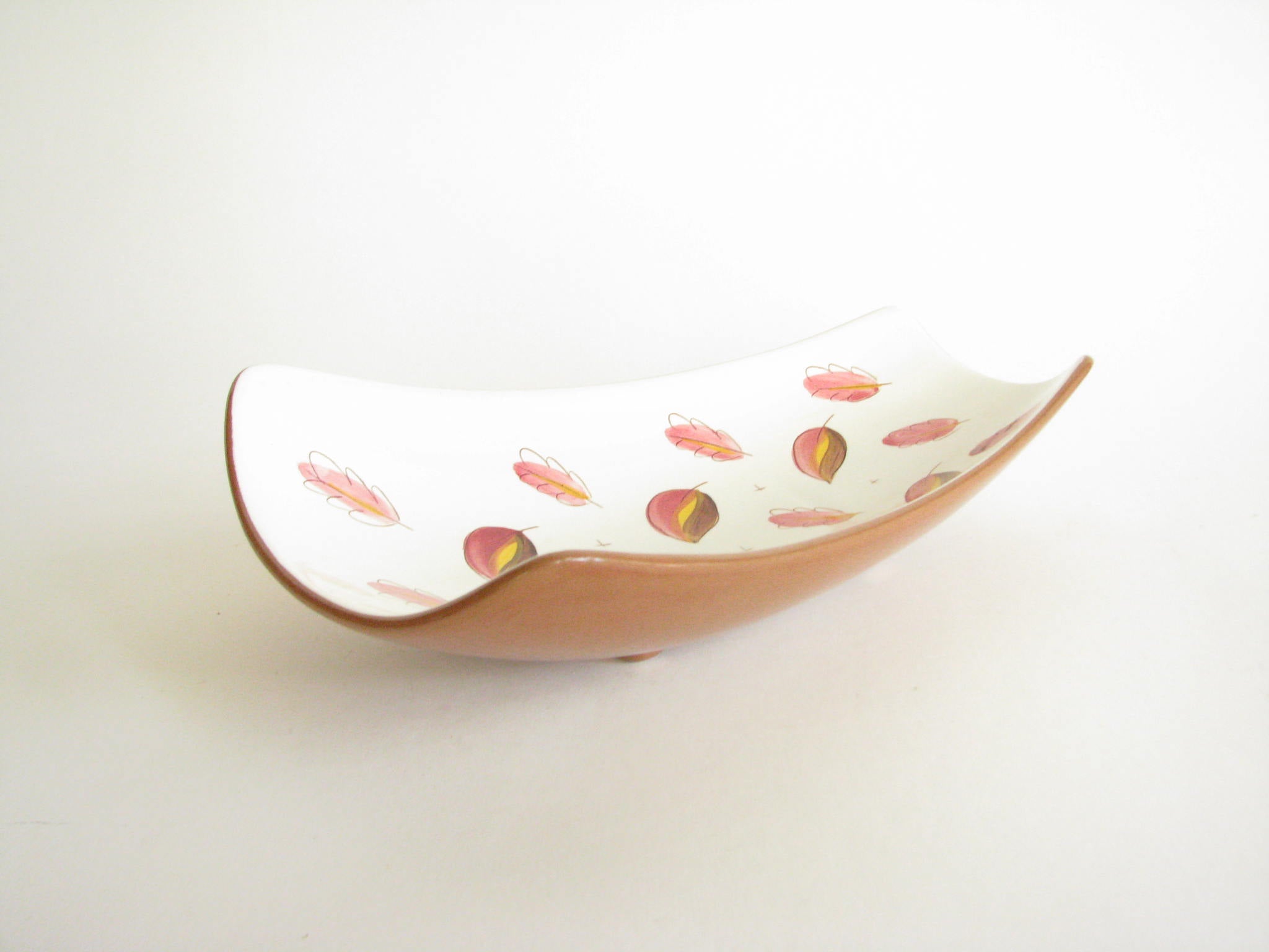 Vintage Stangl Windfall pottery curved relish serving dish designed by Kay Hackett. Hand-carved and hand-painted. The colors are stunning and there is a nice weight to the dish. Stangl began making this pattern in 1955.