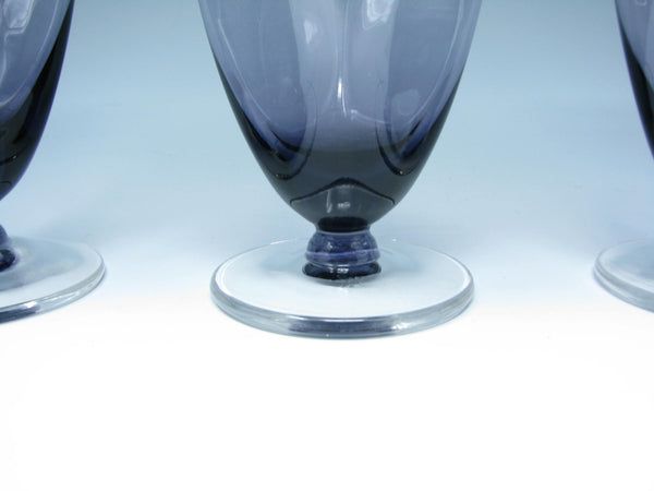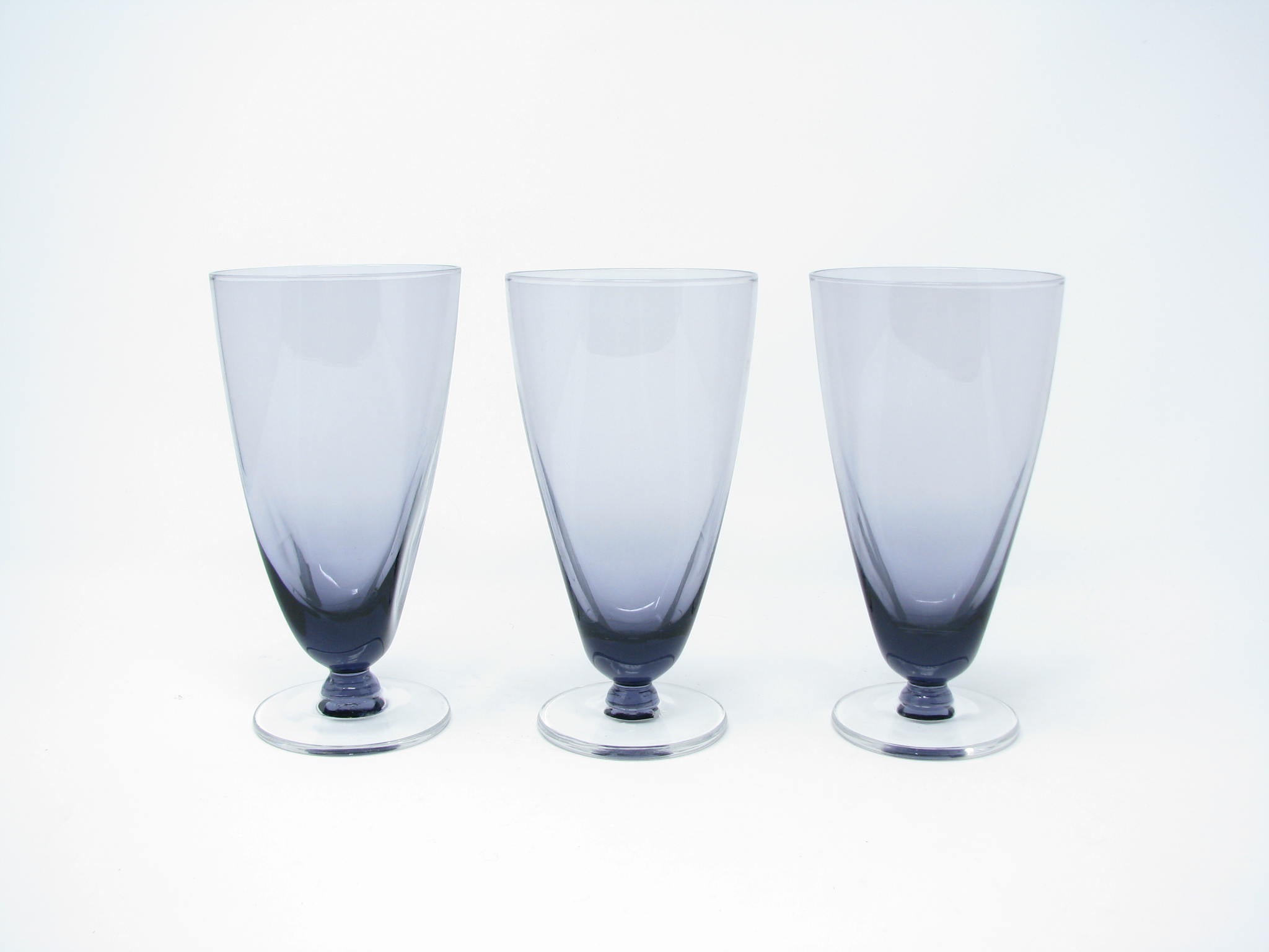 Stunning set of 3 vintage 1950s Imperial Glass-Ohio Sveldt Violet purple footed iced tea glasses. A Russel Wright inspired design as Mr. Wright had designed the Pinch glassware (similar aesthetic) for Imperial Glass-Ohio a few years earlier.