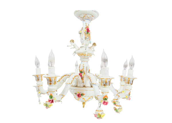 Vintage Italian Capodimonte 8-arm porcelain chandelier. Featuring cherubs and floral motif throughout. Each arm has a hanging ornamental floral rosette.