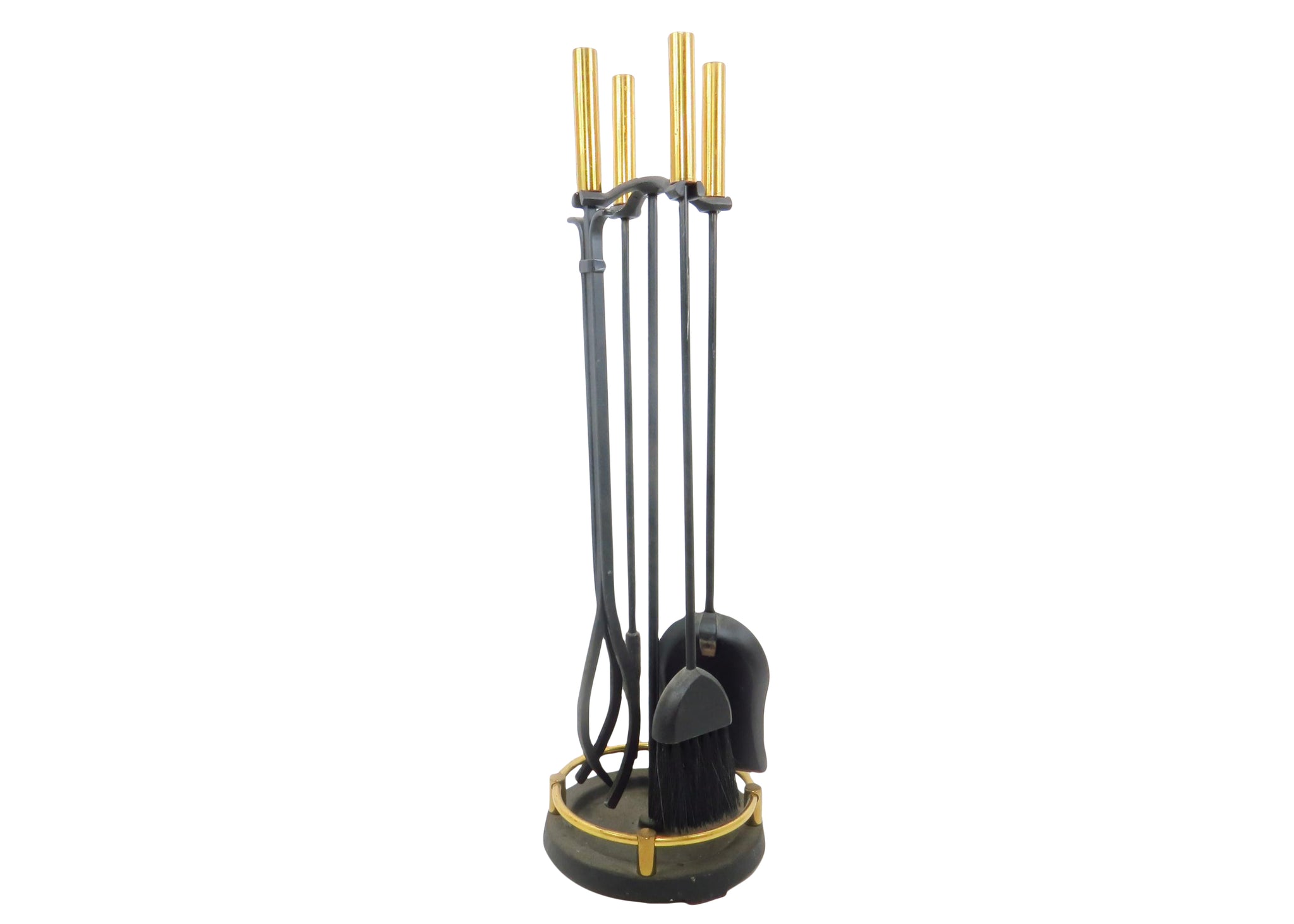 Vintage 1960's Pilgrim 5-piece brass and iron fireplace tool set on round stand. Clean modernist design with solid brass handles and ring accent. Set includes 5 pieces: broom, poker, tongs, shovel, and stand.