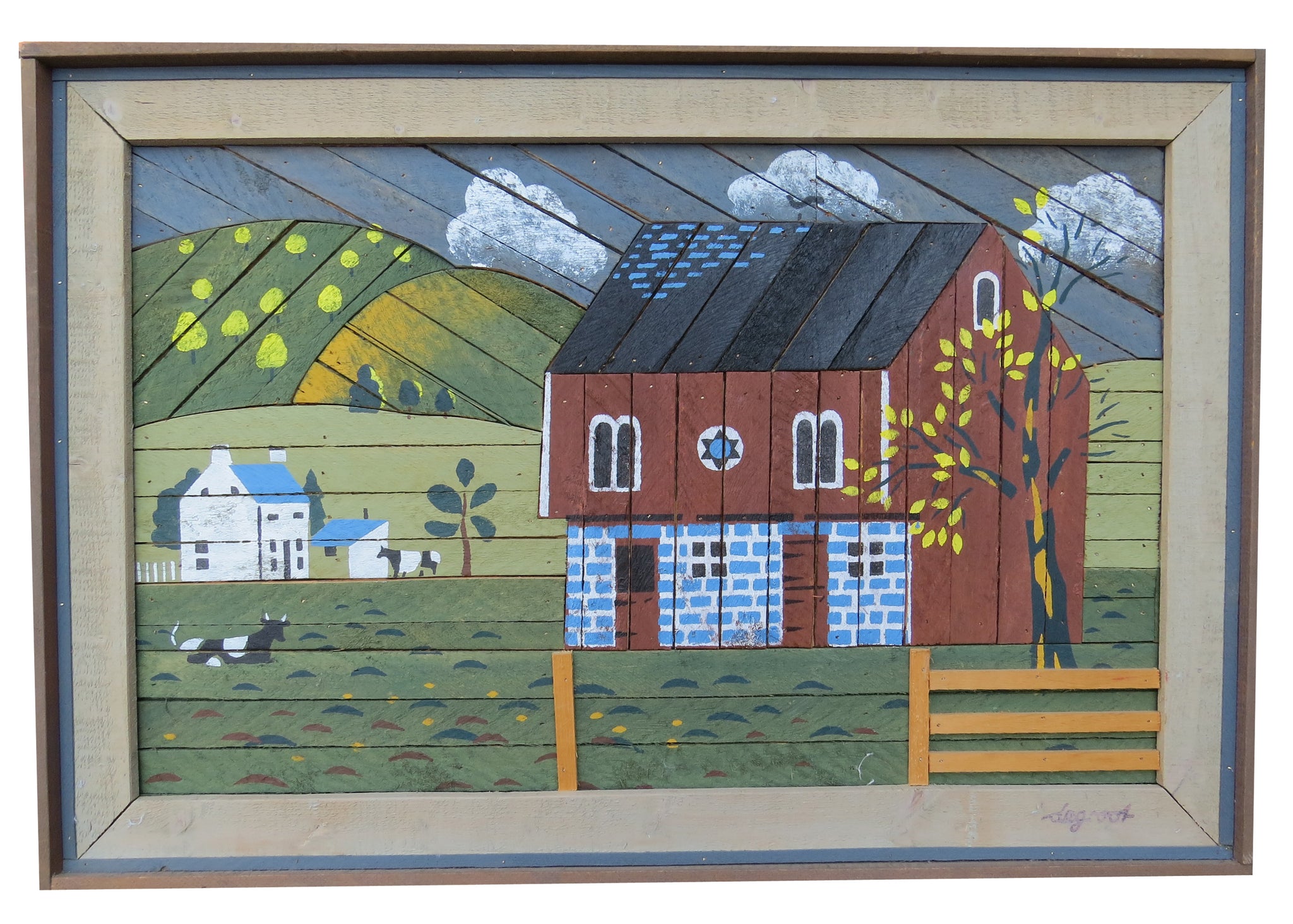 Original deGroot LathArt assemblage by Austin Productions Inc. Charming folk art scene of a red barn with partial fence. From Dutch artist Theodore deGroot.