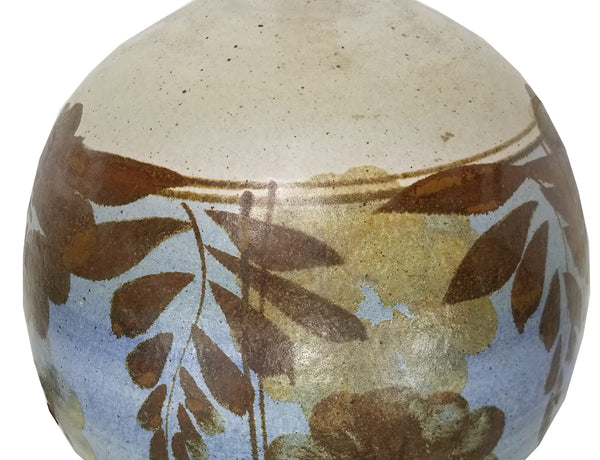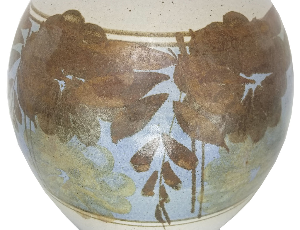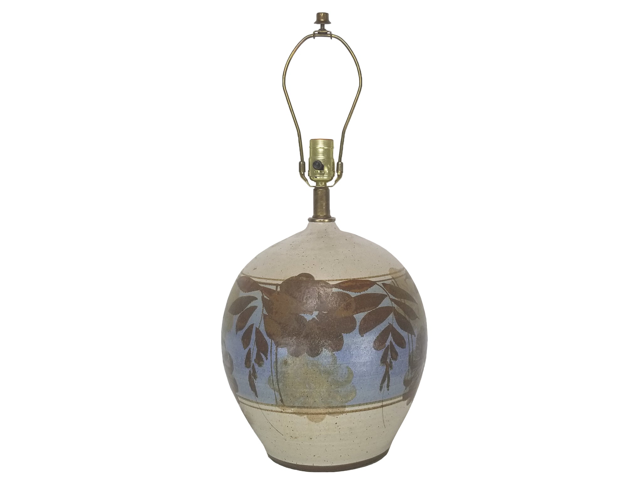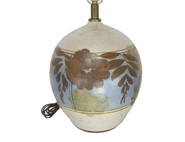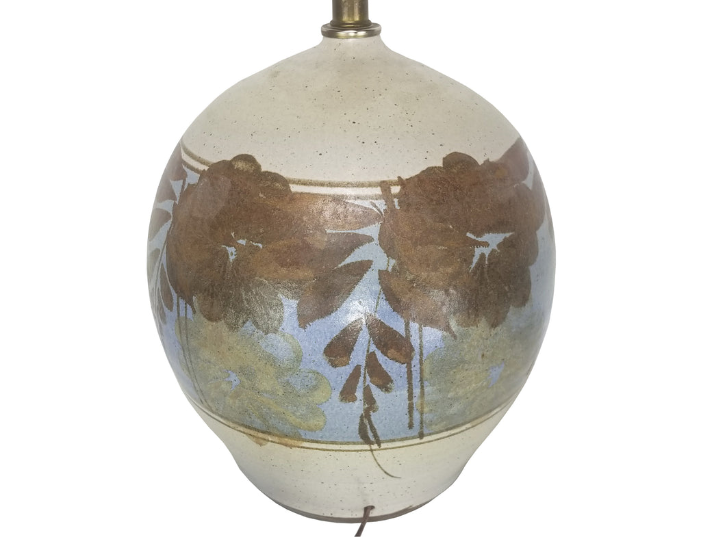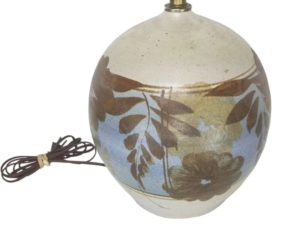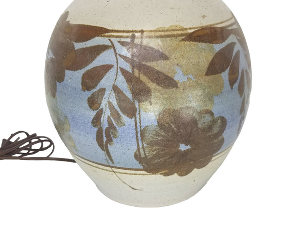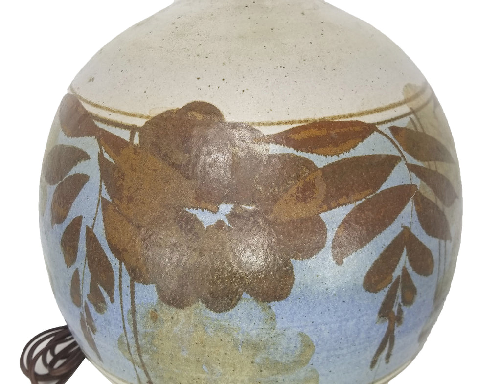 1970's large 10.5" stoneware art pottery table lamp by California Ceramic Company. Elegant glazed, executed in beige, brown and blue colored stoneware with floral motifs.