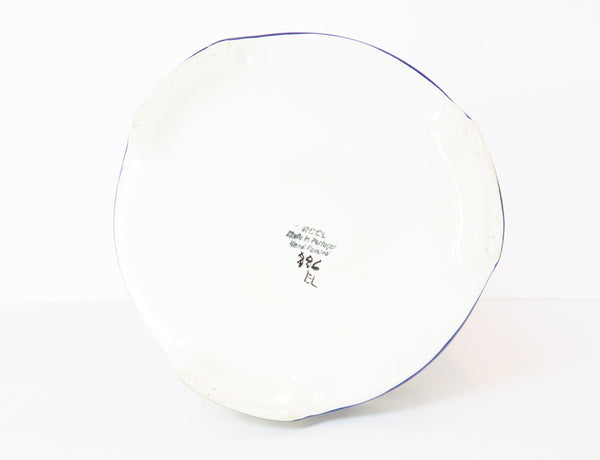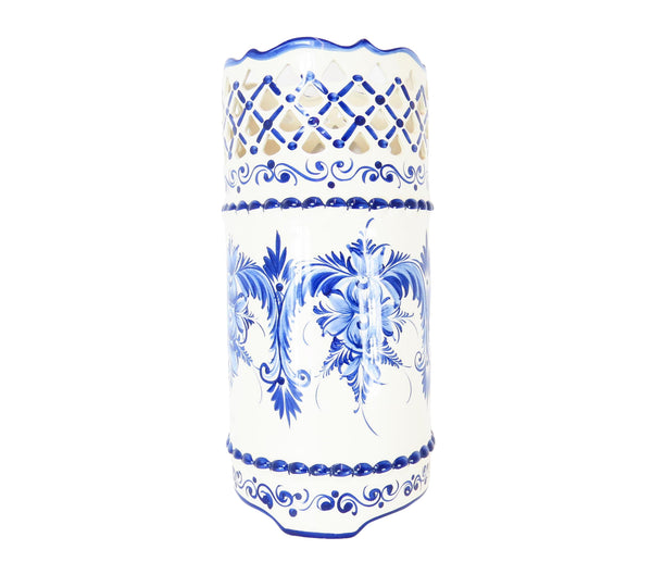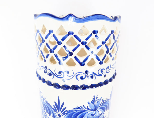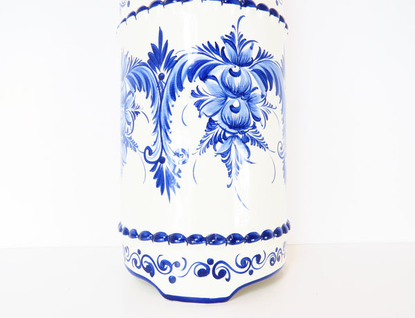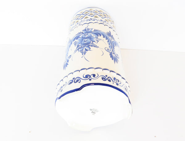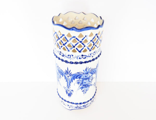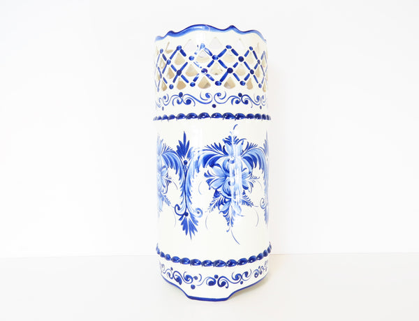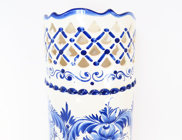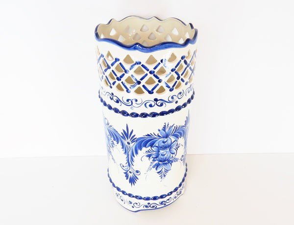 Vintage 1980's blue and white ceramic umbrella stand. Features bright blue hand-painted floral motif with reticulated collar. Made in Portugal.