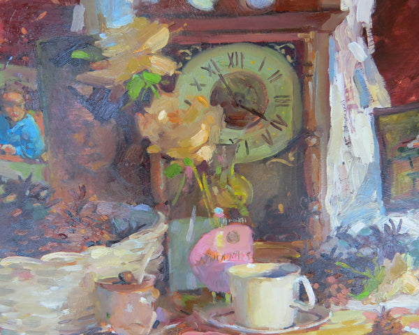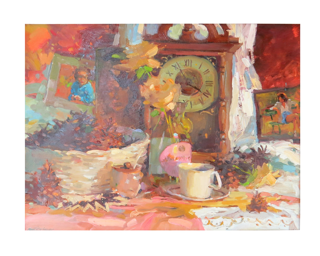 Mimi Litschauer framed still life oil painting on mason board. Signed on lower left front. With personalized note and signature on verso. Possibly commissioned. This work depicts a breakfast table with single coffee cup surrounded by memories such as mini portraits, flowers, and an antique clock. Better known for her plein air subjects, this piece has a strong impressionist or expressionist pallet.