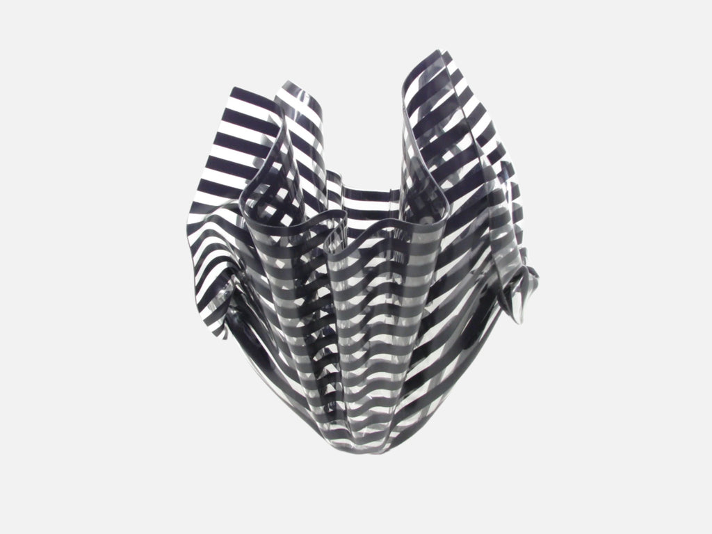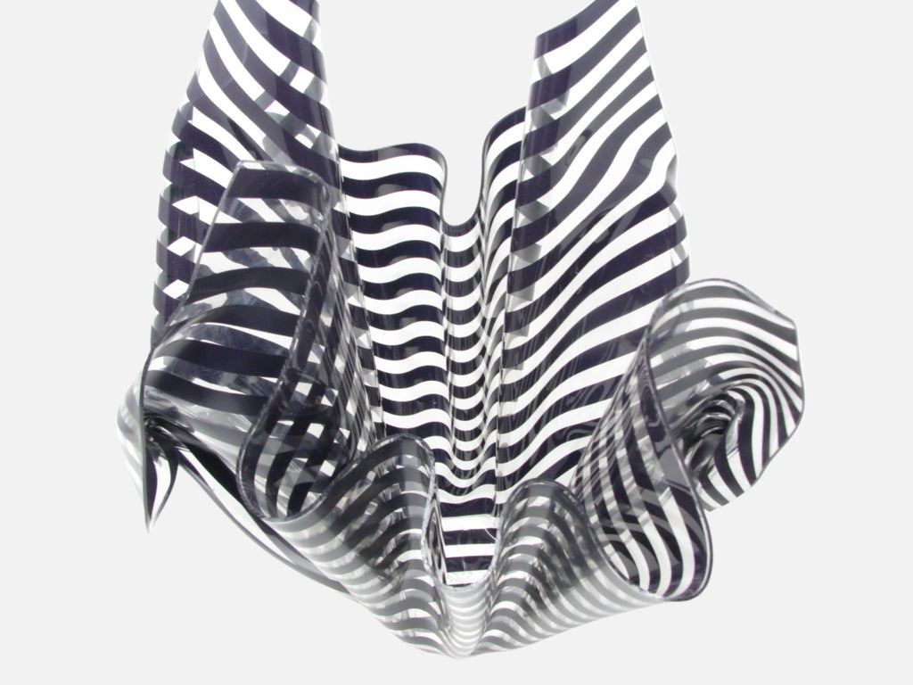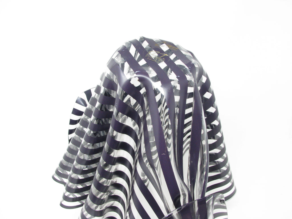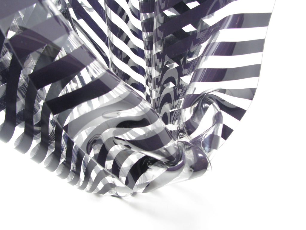 Vintage acrylic handkerchief vase by CT Designs of Charlevoix, Michigan. Clear acrylic with very dark purple (almost black) stripes. Signed on bottom.
