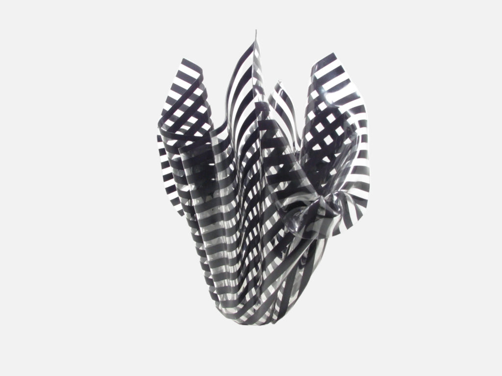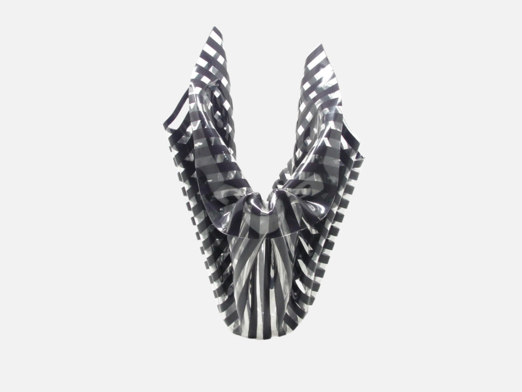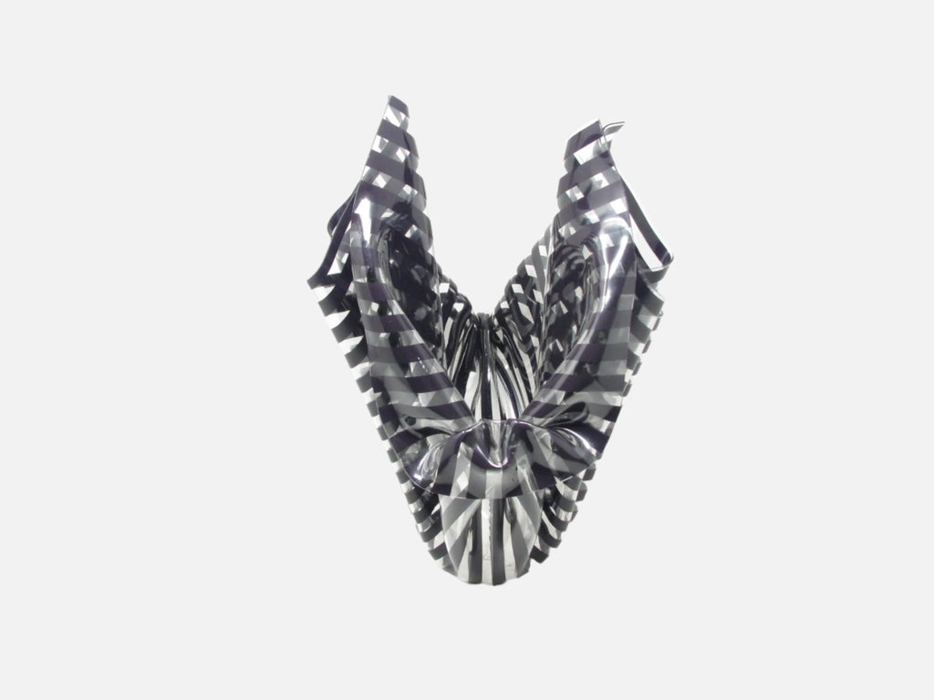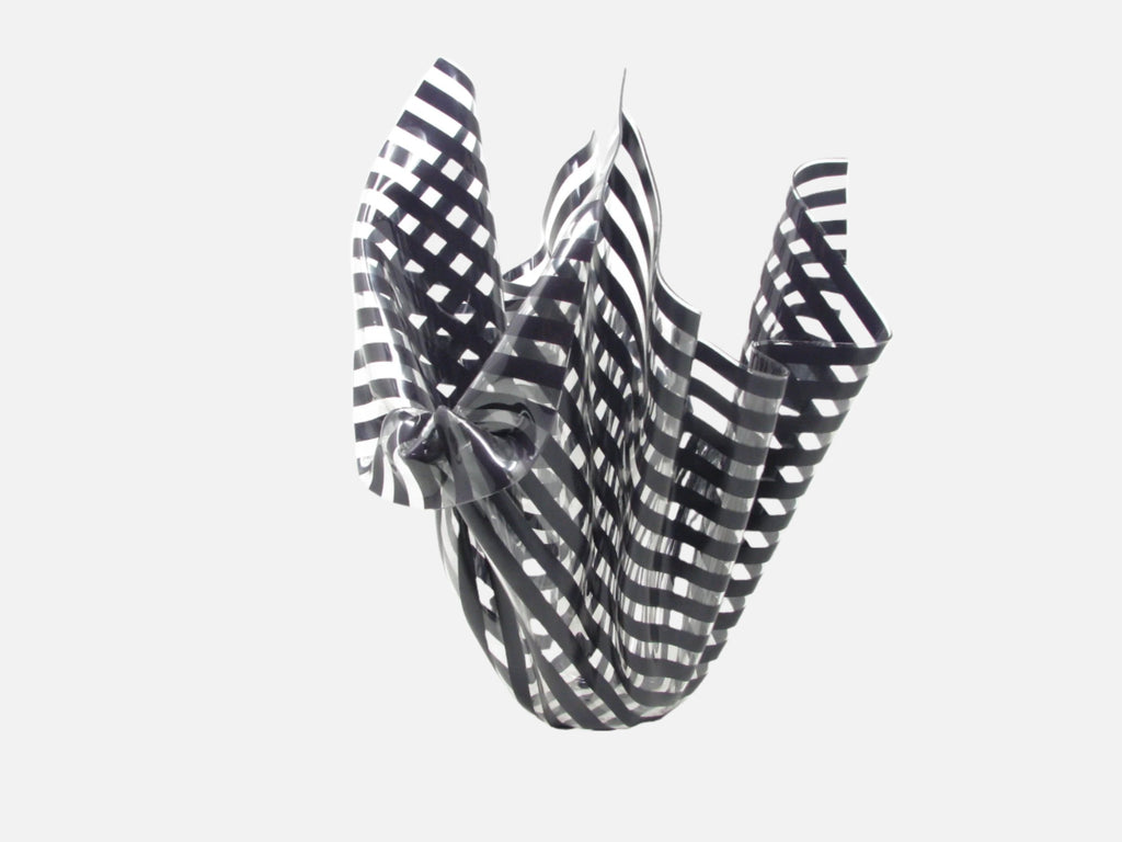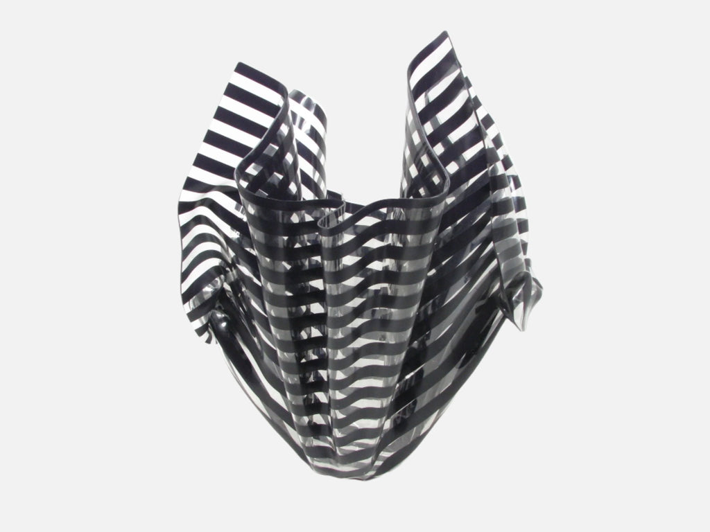 Vintage acrylic handkerchief vase by CT Designs of Charlevoix, Michigan. Clear acrylic with very dark purple (almost black) stripes. Signed on bottom.