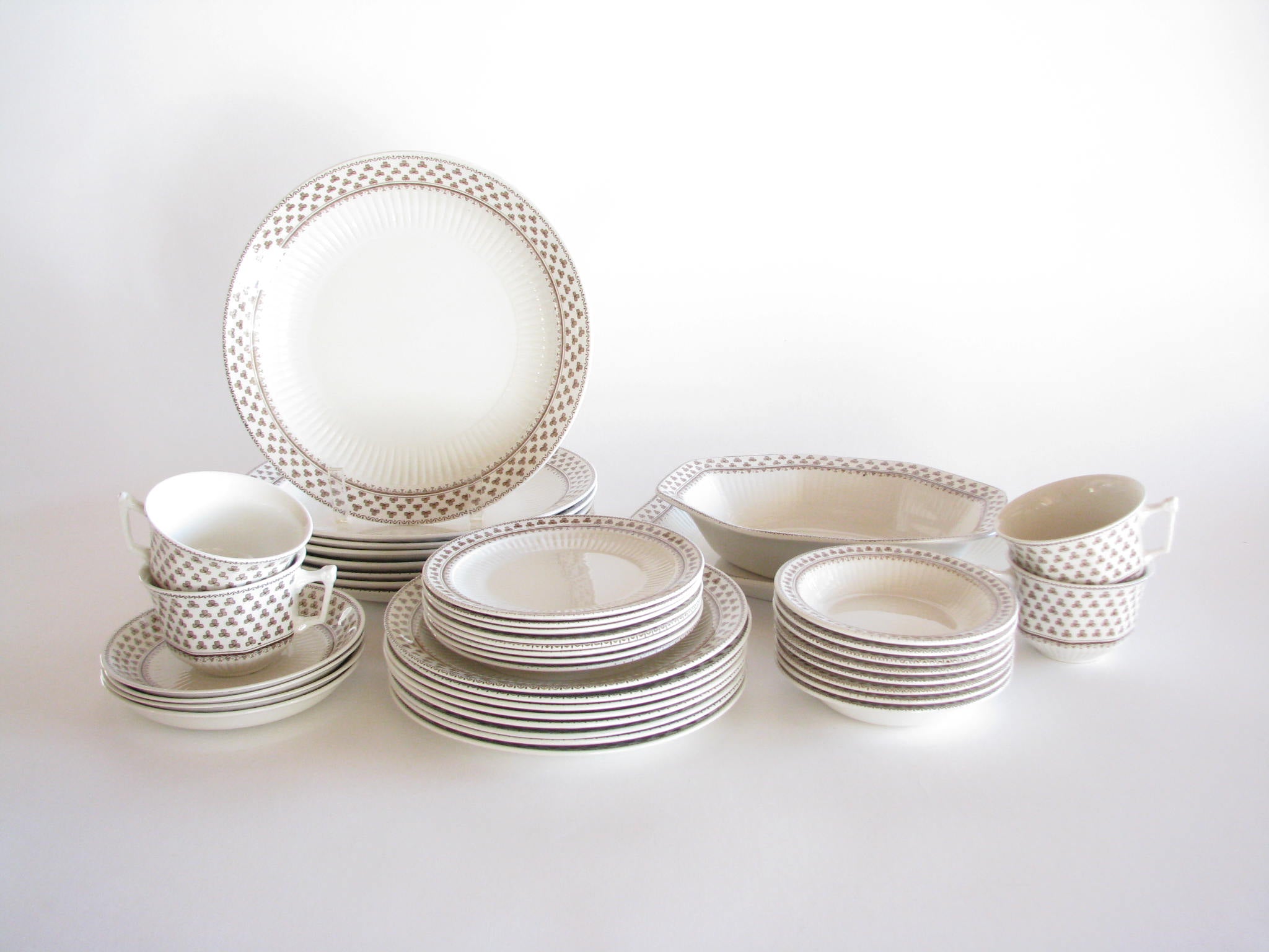 Vintage William Adams & Sons Sharon dinnerware set in cream with brown clover design. Made in England. 'Real English Ironstone'. This 42 piece set includes nearly 8 place settings, platter and serving bowl. Please list below for more information.